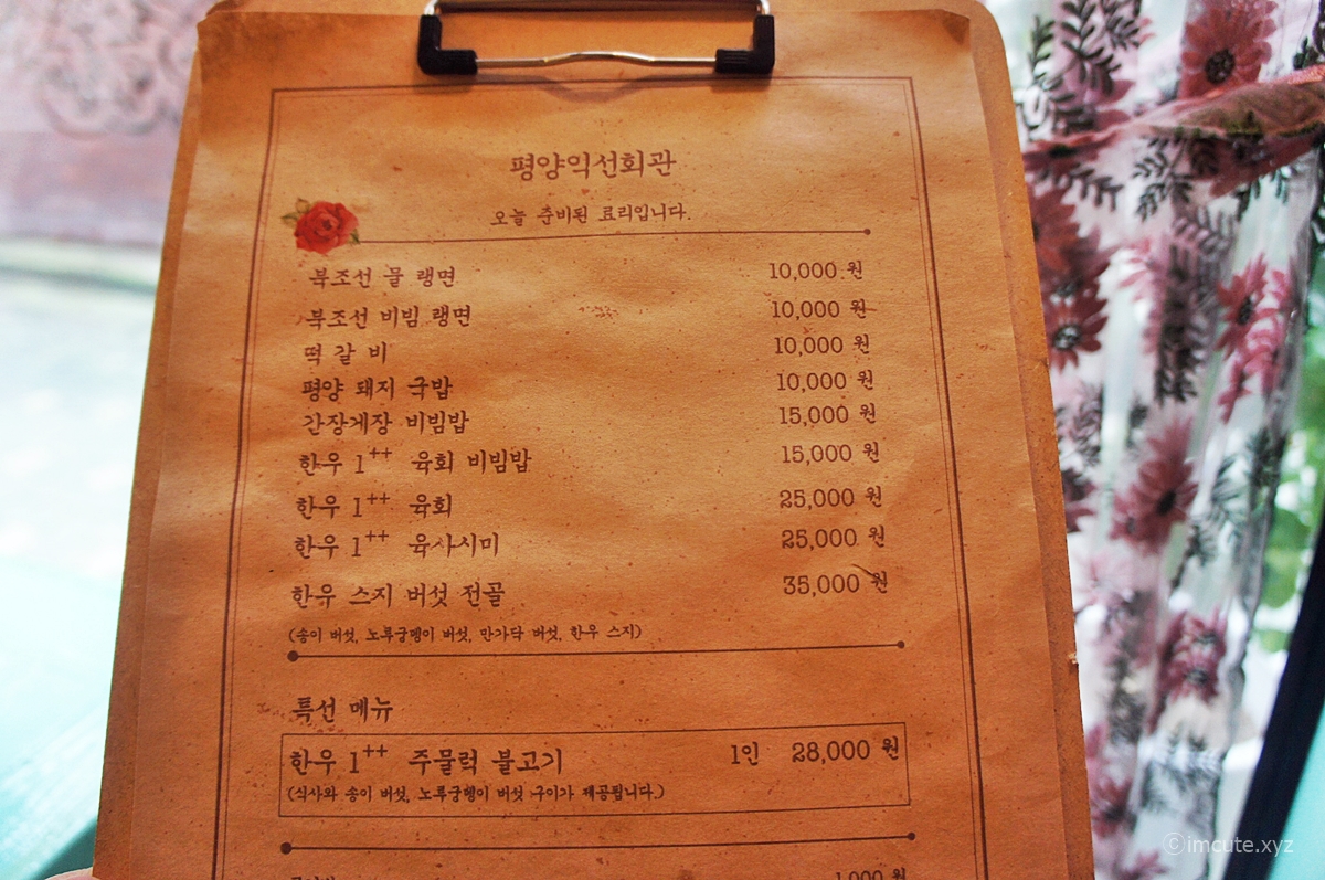 우리는 북조선 물랭면은 꼭 먹어보기로 했습니다. 북조선 비빔랭면, 떡갈비, 평양 돼지국밥, 간장게장 비빔밥도 맛나 보였습니다. 한우를 그것도 1++등급으로 사용한 육회비빔밥, 육회, 육사시미가 있었고요 특선메뉴로 즐기는것도 괜찮겠다 싶었어요. 한우 1++주물럭 불고기에는 식사와 송이버섯 그리고 노루궁뎅이버섯 구이가 제공된다니 너무 대단합니다.