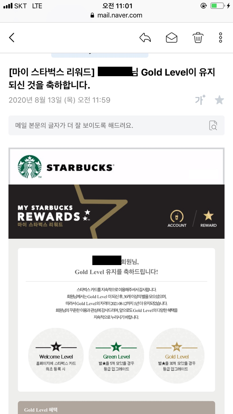 마이 스타벅스 리워드 메일, 스타벅스 골드레벨 혜택 연장하다