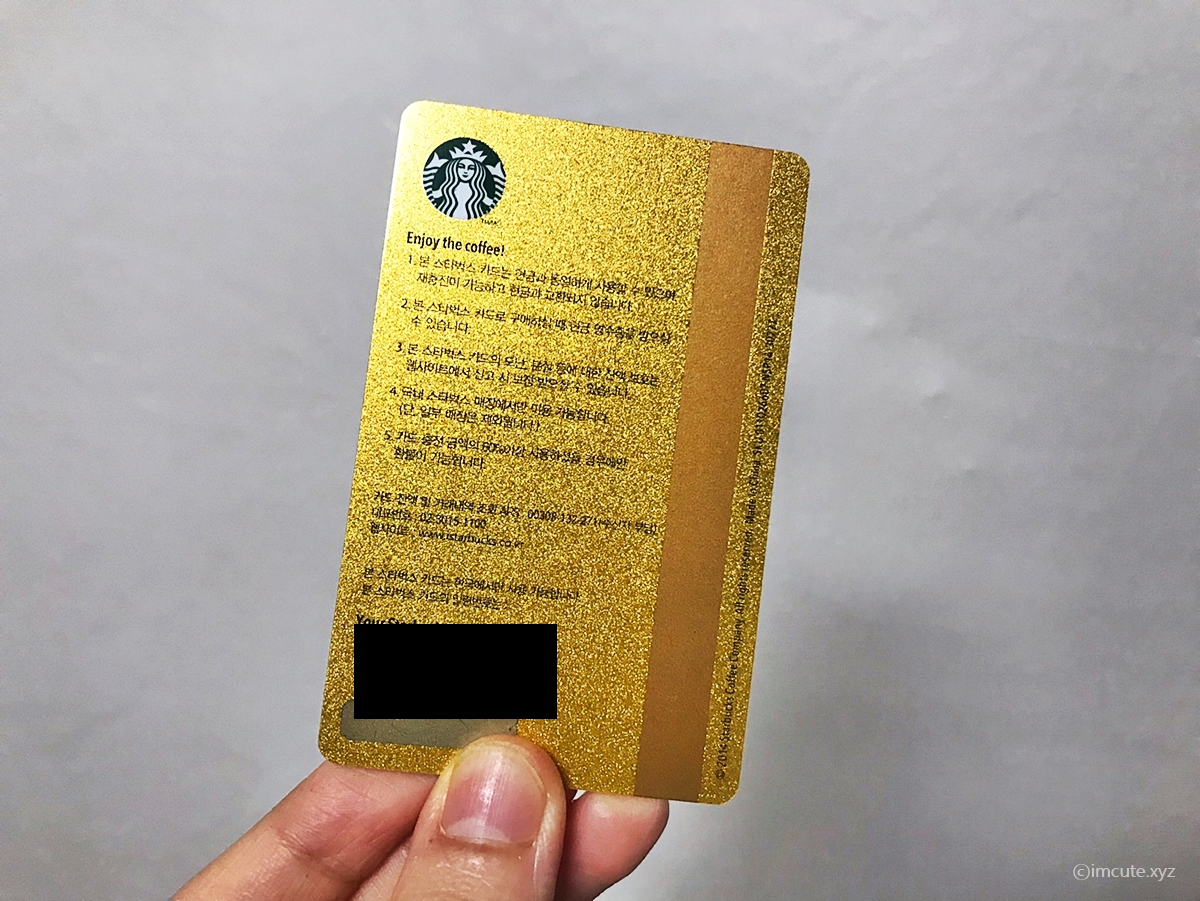 카드 뒷면입니다. 혜택과 장점이 많으니까 골드회원 자체가 된것이 기쁨으로 느껴지는 것 같기도 합니다. 저는 음료수 조금만 더 모으면 톨사이즈 무료쿠폰을 받으니까 그거 먹고 또 리뷰 올려 볼게요. 마이 스타벅스 리워드로 다 알려주고 별을 얼마나 모았는지도 손쉽게 확인이 가능하니, 스타벅스 앱을 적극 활용해보시면 더욱 좋겠습니다. 골드레벨 혜택 이렇게 알아봤으니 꼭 여러분도 연장하셔서 더욱더 맛난 커피 타임 하시길 바라요. 저도 이 오밤중에 또 티타임이 하고싶어져서 언능 자야겠습니다.