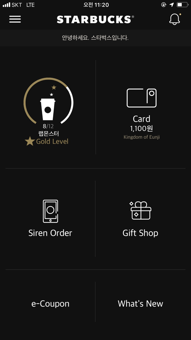 닉네임과 함께, 바로 골드회원의 상징 금색 별이 화면에 보입니다. 카드로 잔액이 얼마 남았는지 보이고 e-Coupon(이쿠폰) 그리고 새로운 프로모션을 볼수있는 What's NEW 메뉴가 있습니다.