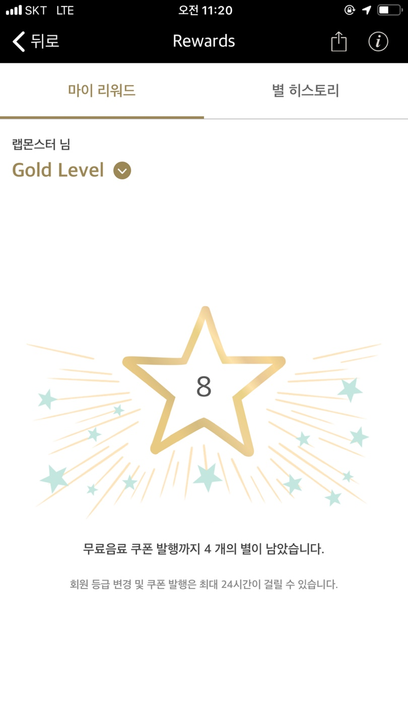 실제로 별을 12개 모으기 전에 숫자가 뜨면서 이렇게 별에 하나하나씩 적립이 되는 것이 확인 가능합니다. 금색 별에 숫자 8이라고 써 있는 제 화면이고요~ 이번에 이렇게 사 먹었다 알 수가 있는 화면입니다. 회원 등급이나 쿠폰발행은 24시간이 걸릴수 있으니 바로바로 업데이트가 되지 않아도 걱정하지 말고 조금 기다리심 된답니다.