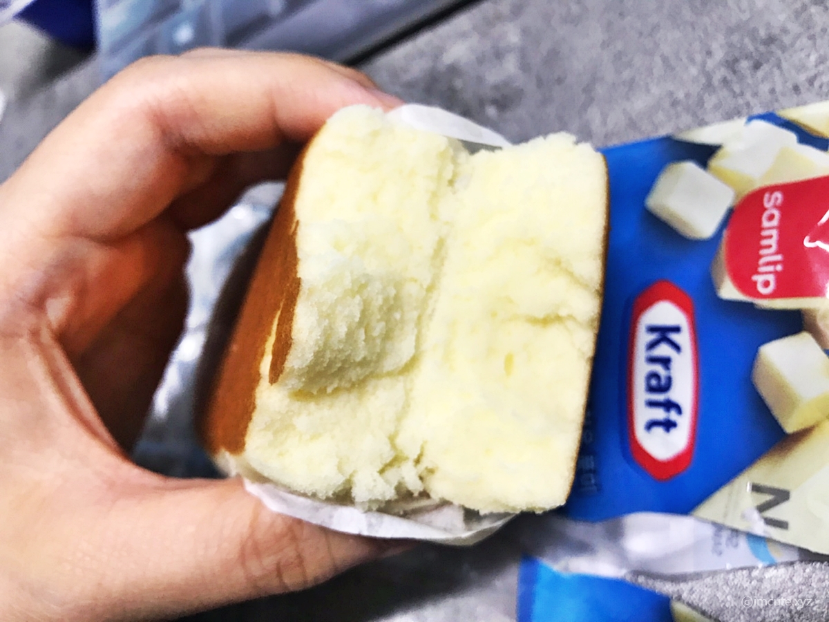 가까이서 보니 더 먹음직스럽습니다. 사실, 편의점 빵은 일반 빵집의 그것들보다 안 촉촉한게 많아서 손이 잘 안가는데요 이건 정말 부드럽더군요..단면을 보여드려야 더 믿으실거 같아서 이제 단면 보여드립니다.