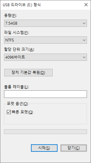 포맷 옵션이 뜹니다. 원래 8GB짜리 usb라 용량도 잘 확인되었고요, 원하시는 옵션을 선택하여 포맷해주시면 되겠습니다! 저는 빨리 포맷되는 빠른포맷 강츄!