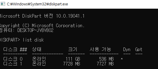 1. list disk : 물리적인 하드 디스크 리스트를 나타냅니다.
