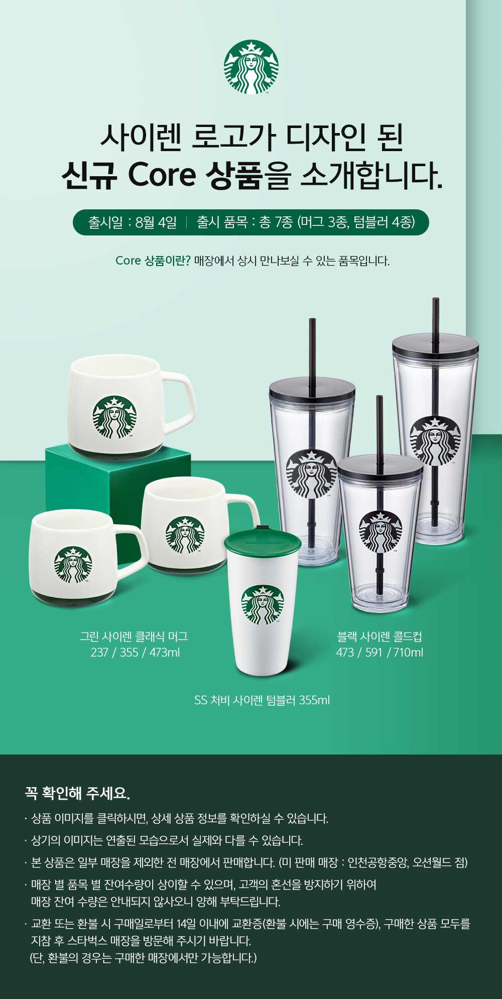 스타벅스 코리아에서 이번에 나온 엠디입니다. 8월 4일 출시된 따끈따끈한 제품인데요 그린 사이렌 클래식 머그가 각각 237ml, 355ml, 473ml으로 나왔고요. SS처비 사이렌 텀블러 355ml짜리도 나왔습니다. 블랙 사이렌 콜드컵은 살짝 투명한 형태로, 473ml, 591ml, 710ml으로, 얼음을 넣는 것을 감안해서 크게 나왔답니다.