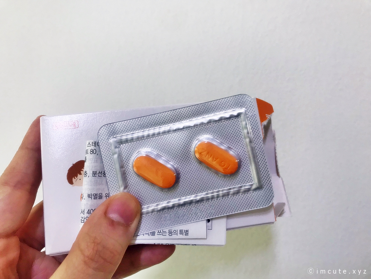 살짝 주홍빛을 가진 알약이 2개가 보입니다. 크기는 좀 커서, 그냥 삼키기 뭐하면 냠냠 씹어드시면 되겠습니다. 한 번 먹고 나는 일주일 있다가 또 먹어야지~