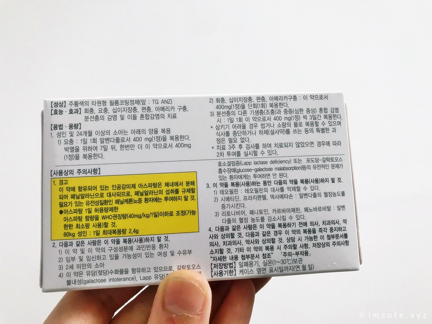 성인 및 24개월 이상의 소아는 요충 박멸을 위해 1일 1회 알벤다졸 정을 400mg(1정)복용하면 됩니다. 요즘엔 약이 원체 좋아서 1알만 먹으면 대략적으로 모든 구충이 다 박멸된다고 보시면 되는데요, 약국에 물어보니 정 걱정되면 1주일 있다 한 번 더 먹으라고 알려주셨습니다.