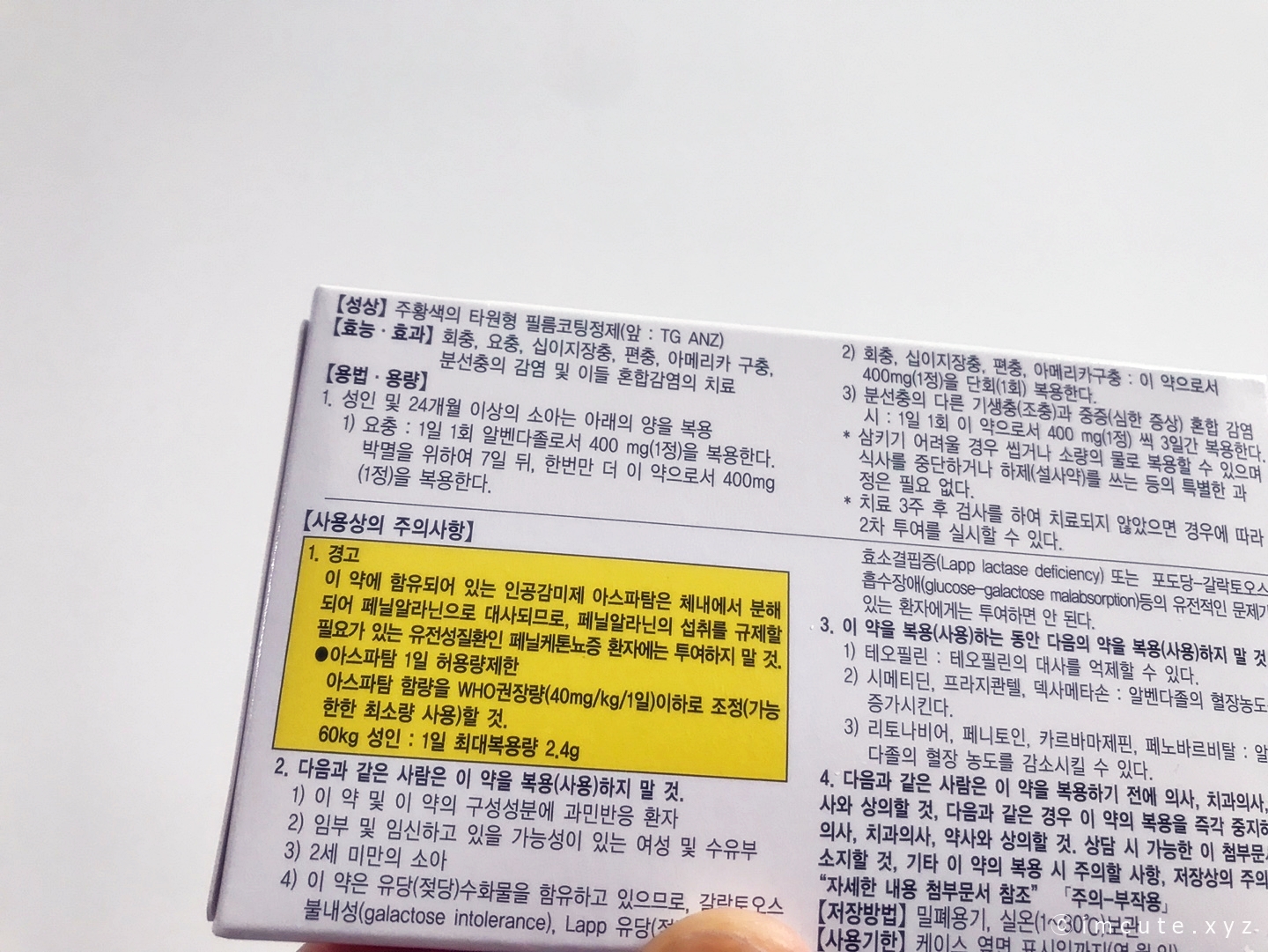 저는 그냥 약국에서 알벤다졸 주세요라고 해서 사 먹었습니다. 바나나향의 구충제로 알나졸정 400mg입니다. 제가 요즘에 두통이 심하고 속에서 헛구역질이 심한 증상이 있었거든요. 아마, 일전에 먹은 곱창에 분변이 있어서 뱉은 거 때문에 더욱 마음의 병까지 안고 갔는지도 모르겠습니다.