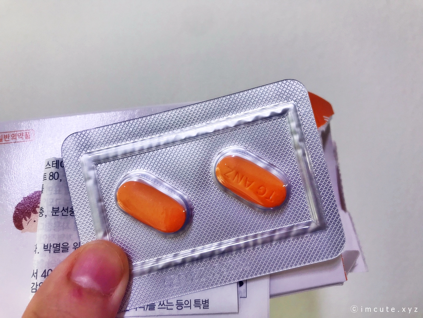 살짝 주홍빛을 가진 알약이 2개가 보입니다. 크기는 좀 커서, 그냥 삼키기 뭐하면 냠냠 씹어드시면 되겠습니다. 한 번 먹고 나는 일주일 있다가 또 먹어야지~