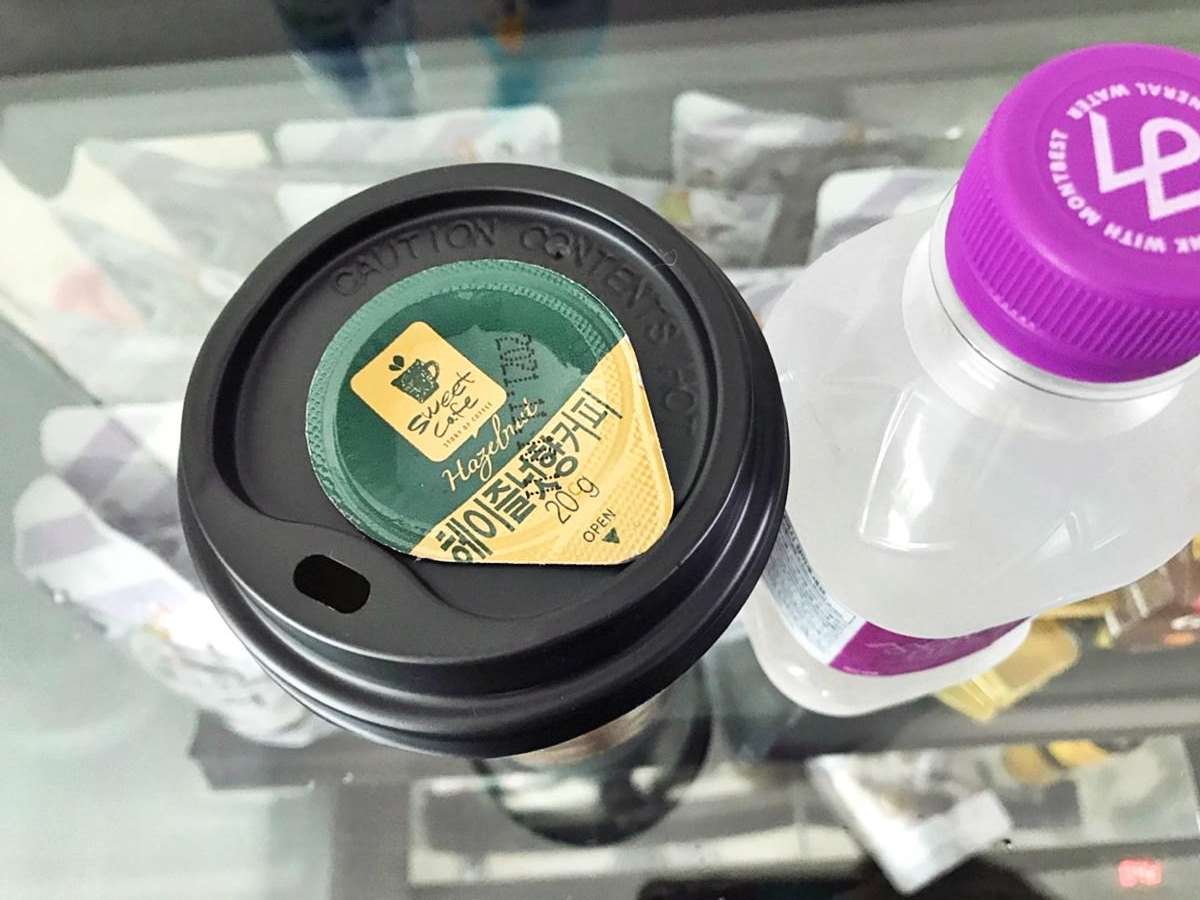 저는 냉수랑 즐기기 위해 생수를 준비했습니다. 뚜껑을 보니 포션이 같이 붙어있고요, 이게 바로 진한 헤이즐넛 커피의 원액이구나 느껴졌습니다.