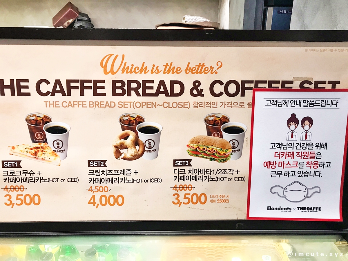 SET1 크로크무슈+카페아메리카노가 3500원, SET2 크림치즈프레즐+카페아메리카노 HOT or ICED가 4000원, 다크 치아바타 1/2조각+카페아메리카노 HOT or ICE 가 3500원으로 살짝 할인된 가격에 제공되고 있었습니다.