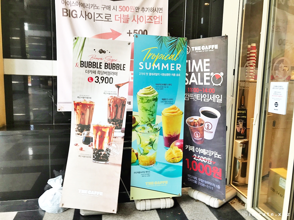 이곳 구디 카페 '더카페'에서는 여러가지 이벤트를 하고 있었습니다. 아이스 아메리카노로 구매시 500원만 추가하면 BIG사이즈로 사이즈 업도 되고 여러가지 음료를 팔고 있어서 눈이 즐겁고 입도 즐거울 것 같습니다. TIME SALE으로 아메리카노의 가격까지 할인해 주더라고요.