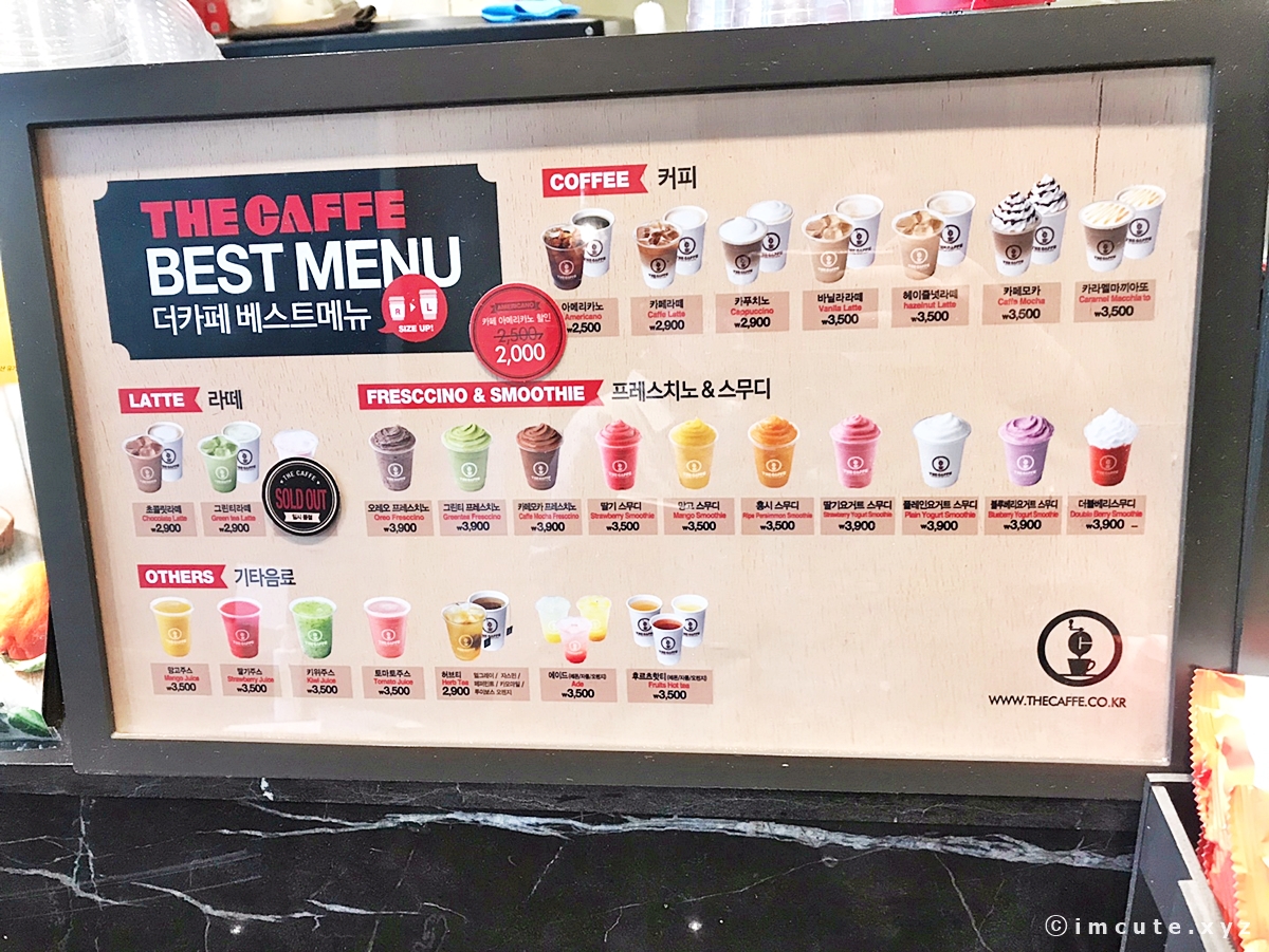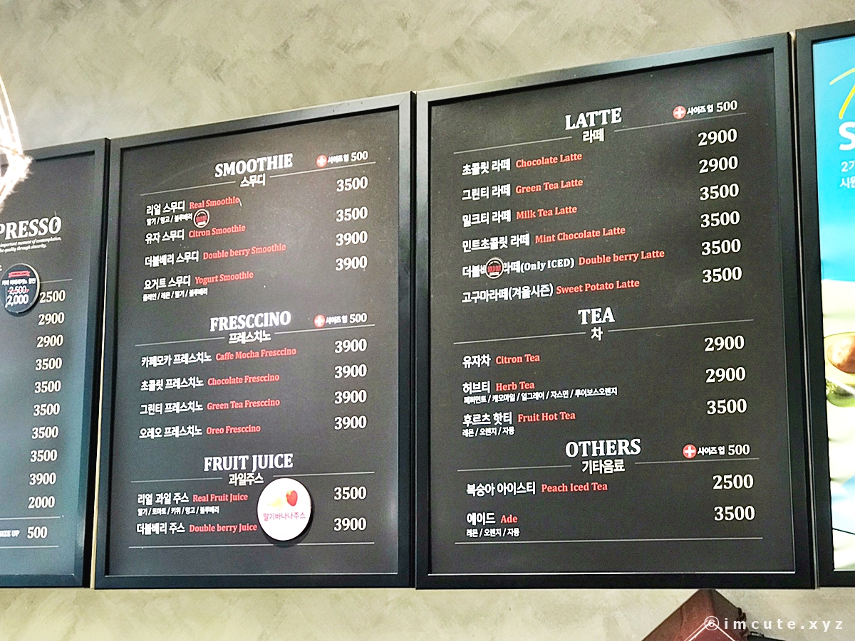 커피는 아메리카노가 베스트인거 같고요, 2500원부터 시작했습니다. 카페라떼 2900원 카푸치노 2900원 바닐라라떼 3500원 헤이즐넛라떼 3500원 카페모카 3500원 카라멜마키아또 3500원입니다. 초콜릿라떼 2900원 그린티라떼 2900원입니다.