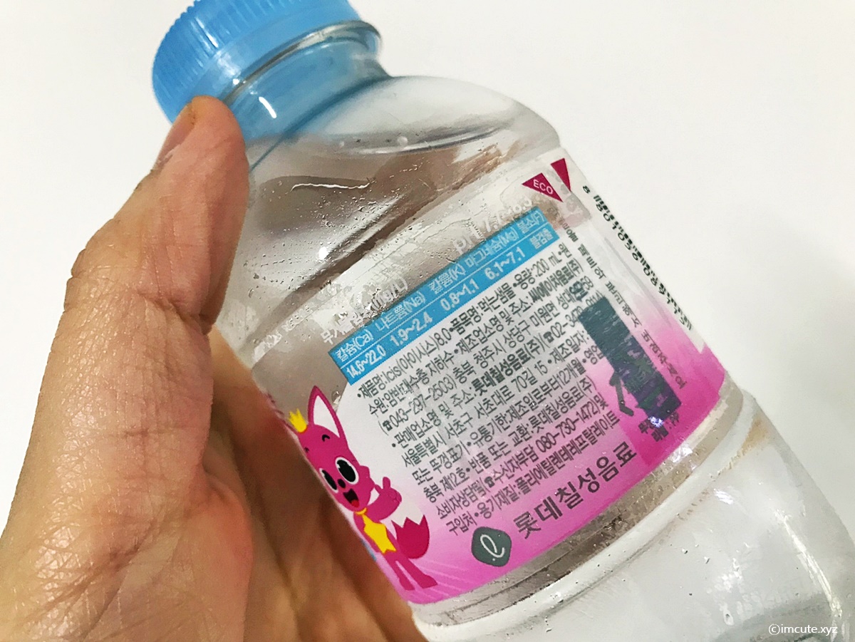 본 물은 내추럴 미네랄 워터라고 써있씁니다. 그리고 pinkfong이라는 문구도 쓰여있었고요, 천연광천수라는 문구도 눈에 띄더군요. 귀여운 핑크색 여우 캐릭터는 왕관을 쓰고 있었고 배에는 별모양 귀요미한 옷을 입고있었습니다.