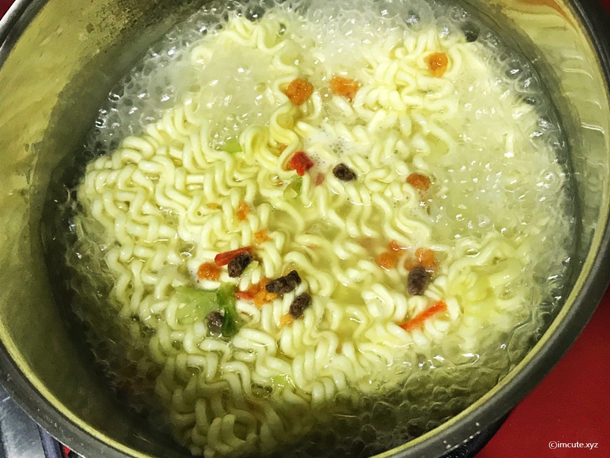 분말스프 안에는 살짝의 꼬기, 그리고 말린 야채가 들어있는데요 양배추와 당근이 주입니다. 삼선이기에 해산물이 들어있으려냐..? 싶은데 뭐가 뭔지 당최 잘 모르겠습니다. 애초에 오징어&새우&홍합이 전부 다 들어가 있다고 하니, 그저 행복하긴 할 뿐이지만요.