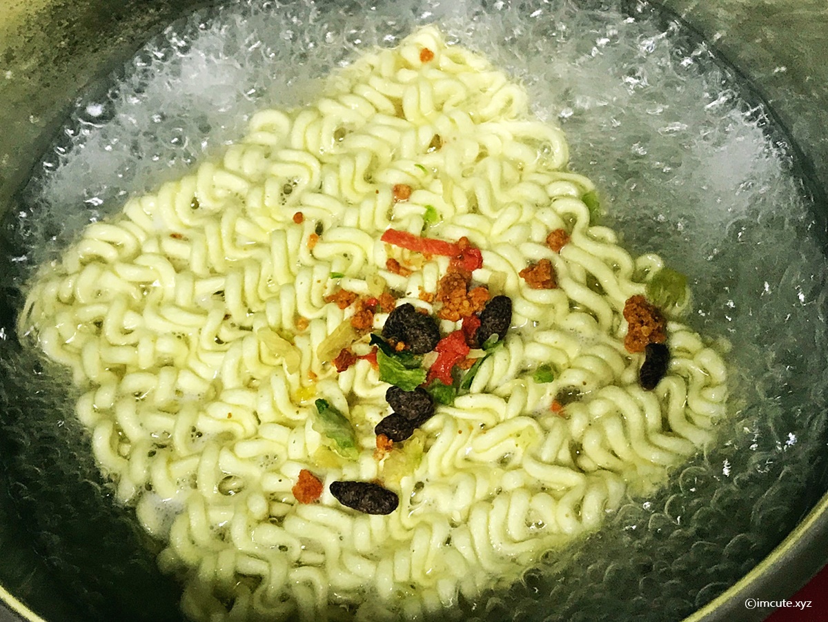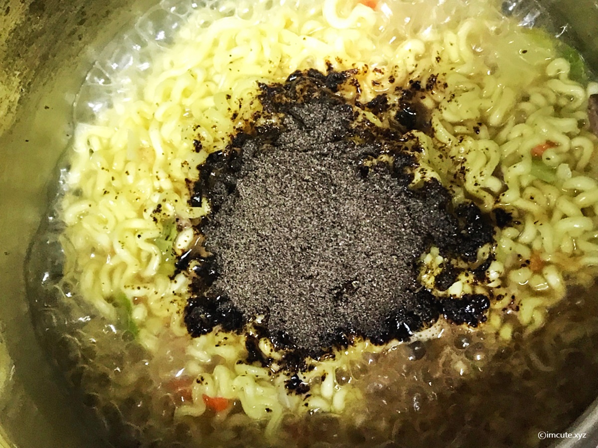 끓는물 600ml에 면과 건더기스프를 넣어줘야 하는데요 후레이크를 꼭 까먹지 말고 넣으시길 바랍니다. 살짝 야채도 들어있고 식감이 살아있는 고기(?)도 들어있잖아요. 면과 건더기스프를 넣은 후 대략 4분 30초간 조리가 됩니다. 물은 8스푼정도 남겨두어야 하는데 양을 잘 모르시겠다면 어림짐작으로 면이 살짝 자박한 정도로까지 냅두시면 됩니다. 그리고 분말스프를 넣고 쉐킷 쉐킷 비벼드시면 오케이!