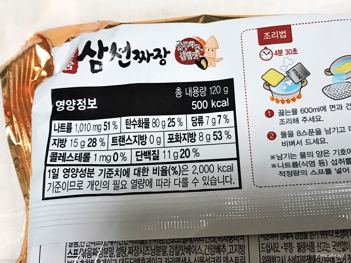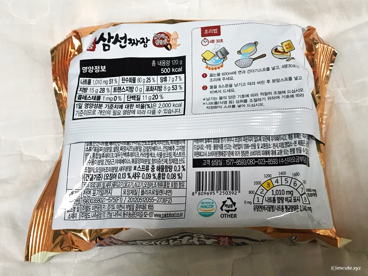집에 항상 라면이 있어서 이걸 사놓길 잘한거 같네요. 농심 짜파게티보단 살짝 라이트한 맛이었던 팔도 삼선짜장이었습니다. 하지만 별로라는 것이 아니라, 정말 훌륭했습니다! 아마 이건 남녀노소 다 좋아할거 같다고 생각한 게, 스프중에는 해물함량이 들어있다고 합니다. 오징어와 새우, 홍합이 살짝식 들어있다니 이건 말 다 한거죠.
