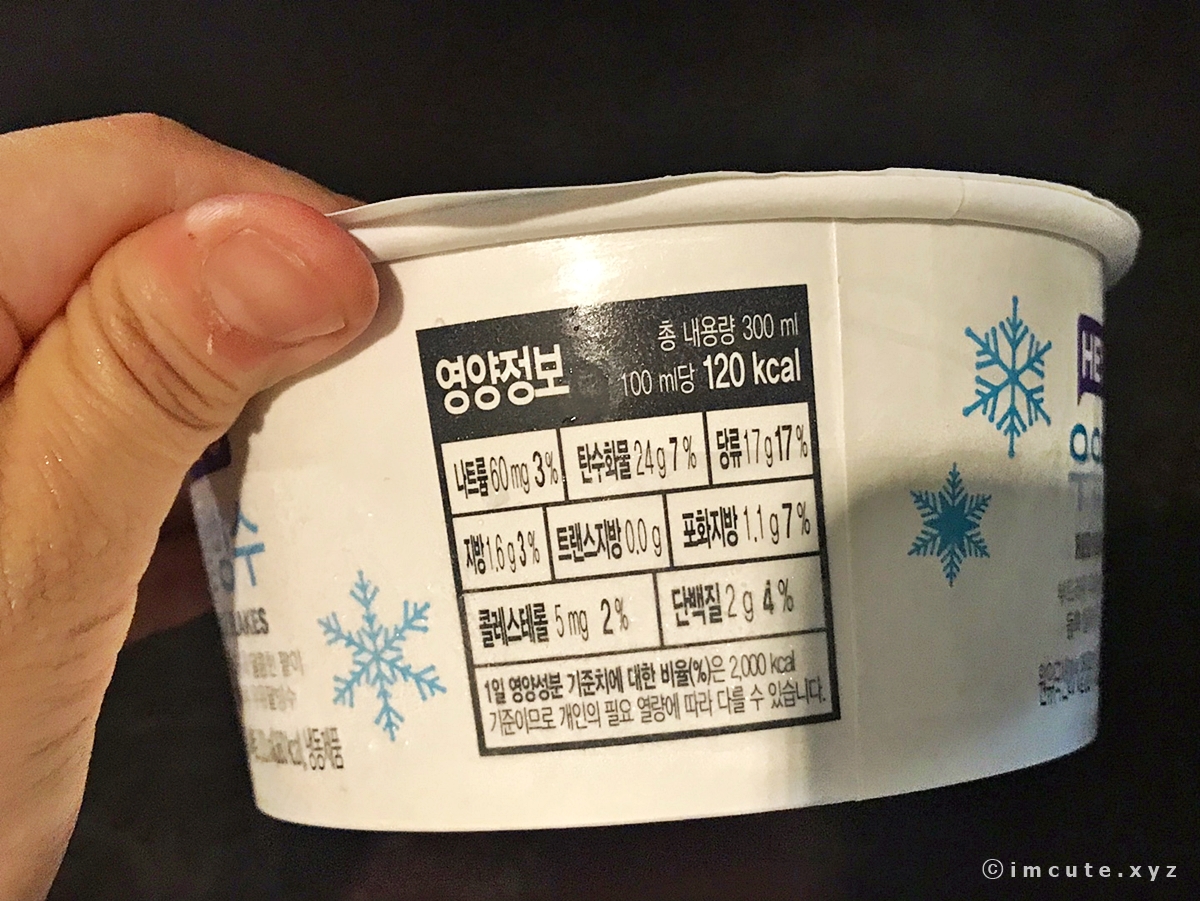 영양정보는 100ml당 120kcal이니까 하나 사서 우유 넣어서 3인이서 나눠먹...으면 양이 적겠고 1인 1빙수는 기본이죠! 디저트는 먹어도 살이 안 찐다고 누군가가 말했습니다. 안에는 단짠을위해 조금 첨가된 나트륨이 있고요 탄수홤루, 당류, 지방, 포화지방, 콜레스테롤, 단백질이 1일 영양성분 기준치에 대한 비율로다가 설명이 되어져 있습니다.