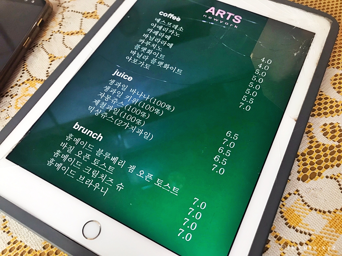 커피메뉴는 이렇게 아이패드로 보여주신답니다. 초록색 바탕은 마치 칠판같은데요 정말 메뉴판이 보기 쉽고 깔끔하죠? 사장님께서는 실제로 옛날에 디자이너로서 전세계에서 활동하셨다고 하네요.
