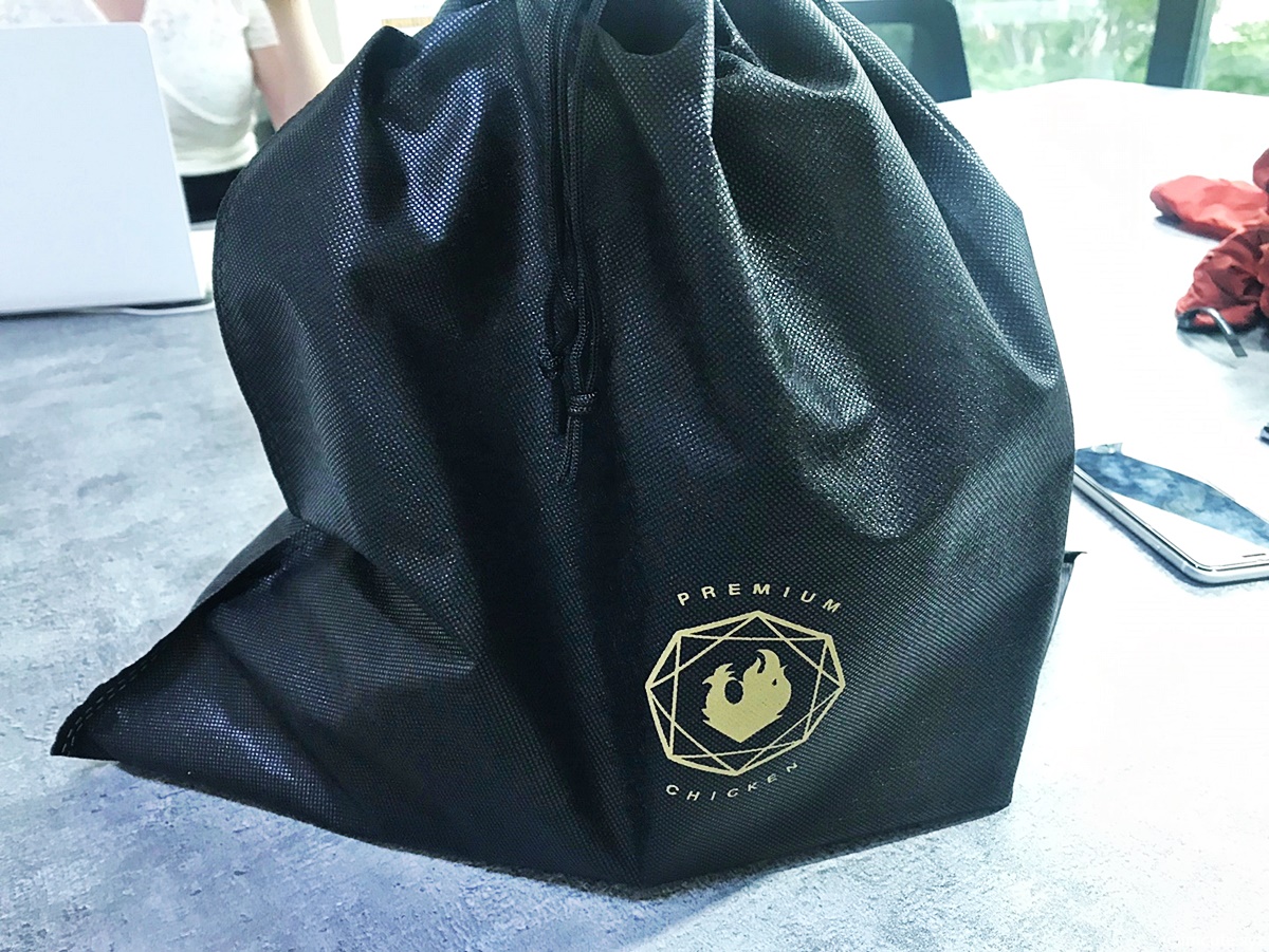 근데 무슨 명품 치킨마냥, 봉다리가 아니라 으리으리한 천으로 된 주머니에 싸 주시더라고요. 가히 복주머니를 연상시키는 것이었는데요 블랙색이라 더욱 품위있어 보이더라고요.