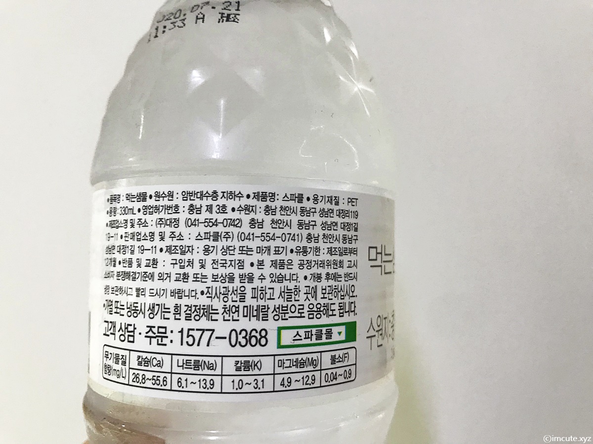 너무 예쁘죠? 물은 자그마한 병이 참 귀엽습니다. 수원지는 충남 천안시 성남면이라네요.