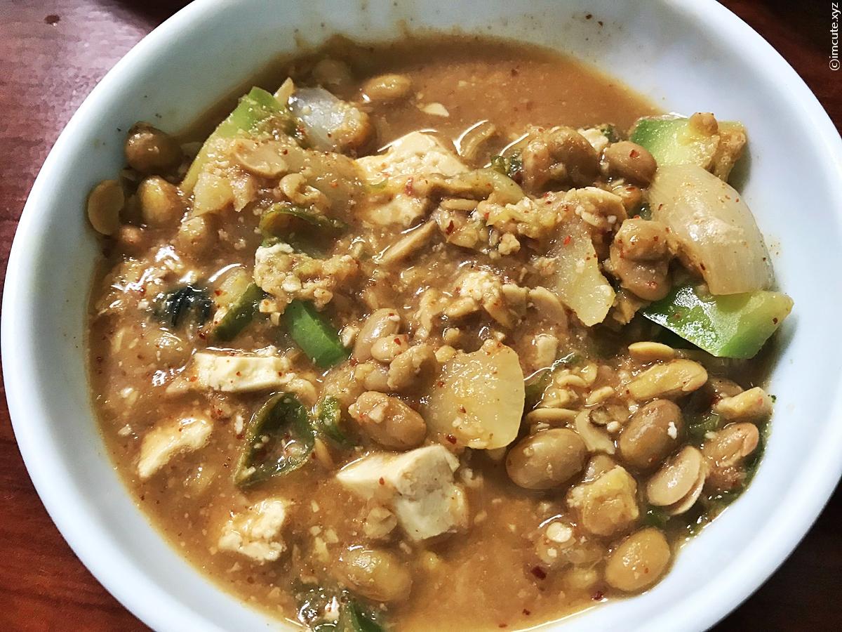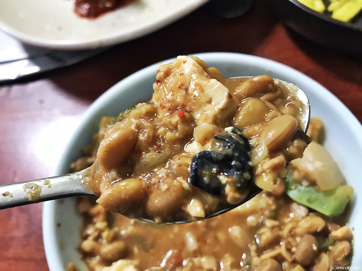 그릇에 한소끔 담아보았습니다. 내용물은 양파, 청국장 용 대두, 고춧가루 등등, 근데 자극적이지 않고 매우 구수하고 깊은 맛을 자랑하더라고요.