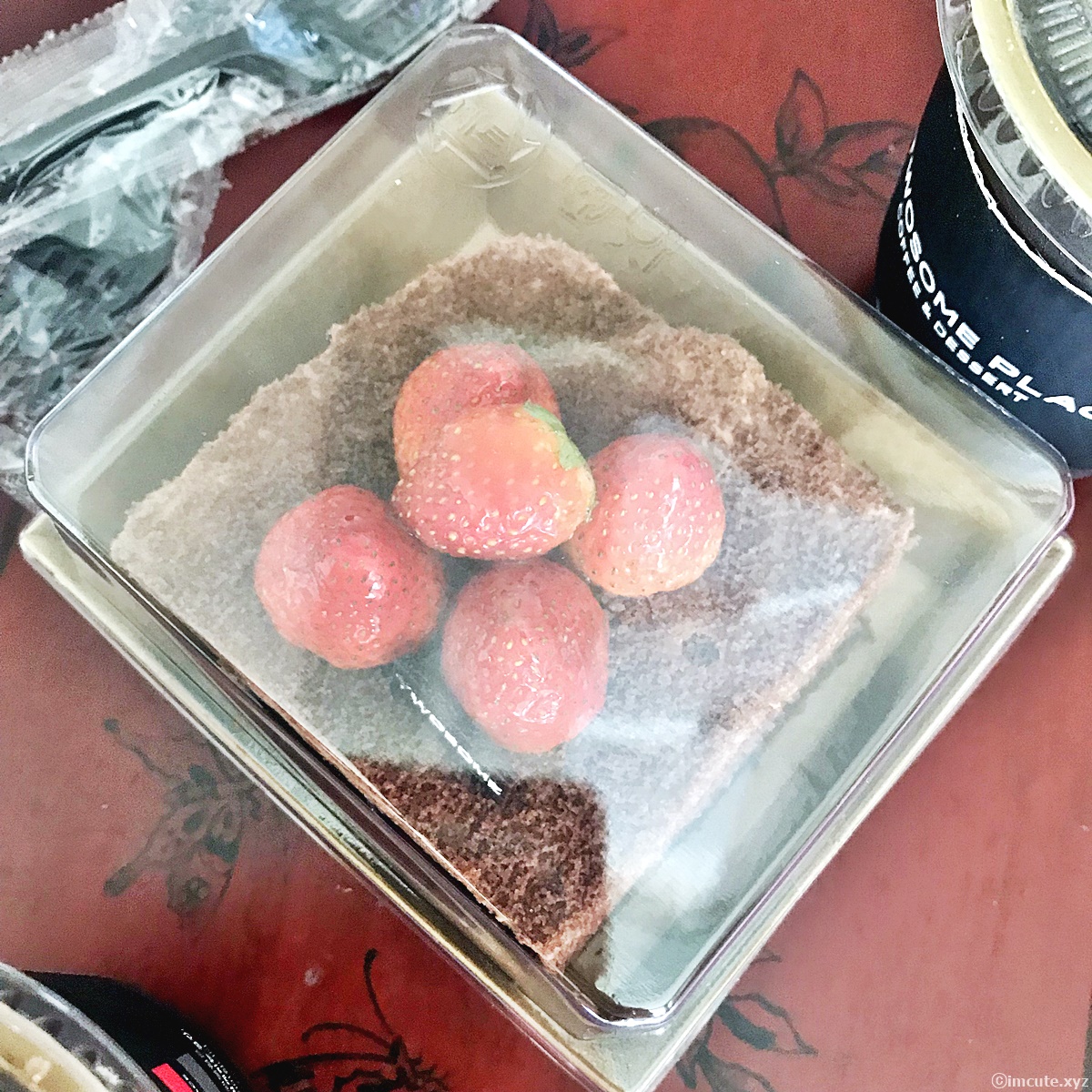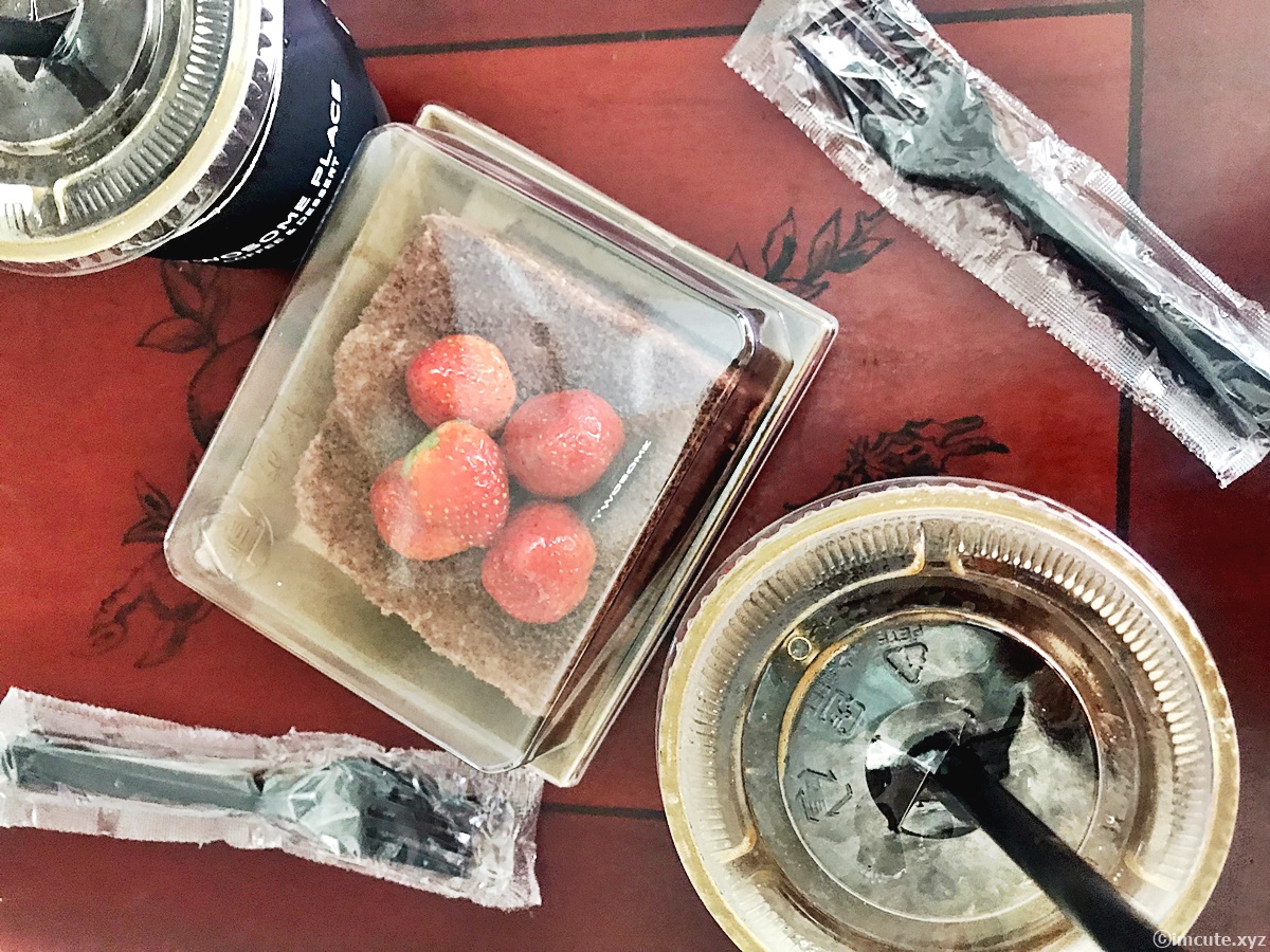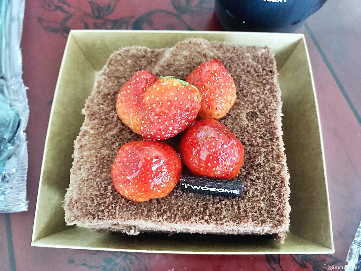 TWOSOME이라고 초콜렛 명패가 붙어있고 위는 달짝지근한 코팅이 입혀져 있는 딸기가 몇개씩 얹어져 있어요. 살짝 탕후루가 연상되는 순간인데요! 너무 고운 자태에 기분이 다 좋아지고야 말았어요. 달달한 디저트는 보기만 해도 기분이 좋은데요, 여러분들도 사랑하는 사람과 근사한 시간을 보내고 싶으시다면 투썸에서 디저트 테이크아웃해서 집에서 즐기시는것도 넘 좋을거 같어요.