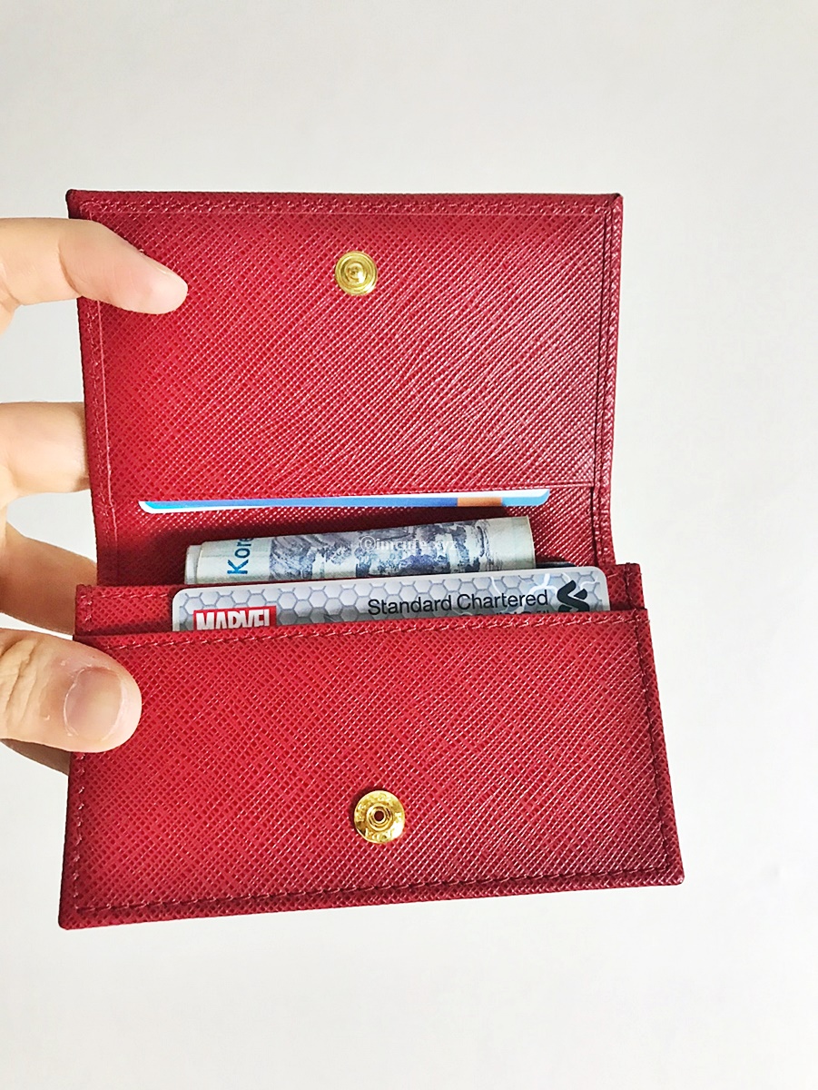 카드 슬롯이고 명함을 넣고 다니는 용도로 더 적합해 보이지만 저는 카드랑 현금 그리고 동전 조금만 넣으면 되어서 이정도 크기가 딱입니다! 미니멀리즘은 이렇게 시작하는 것이겠지요. 똑딱이 부분도 앞에 있는 프라다 로고처럼 금장입니다.