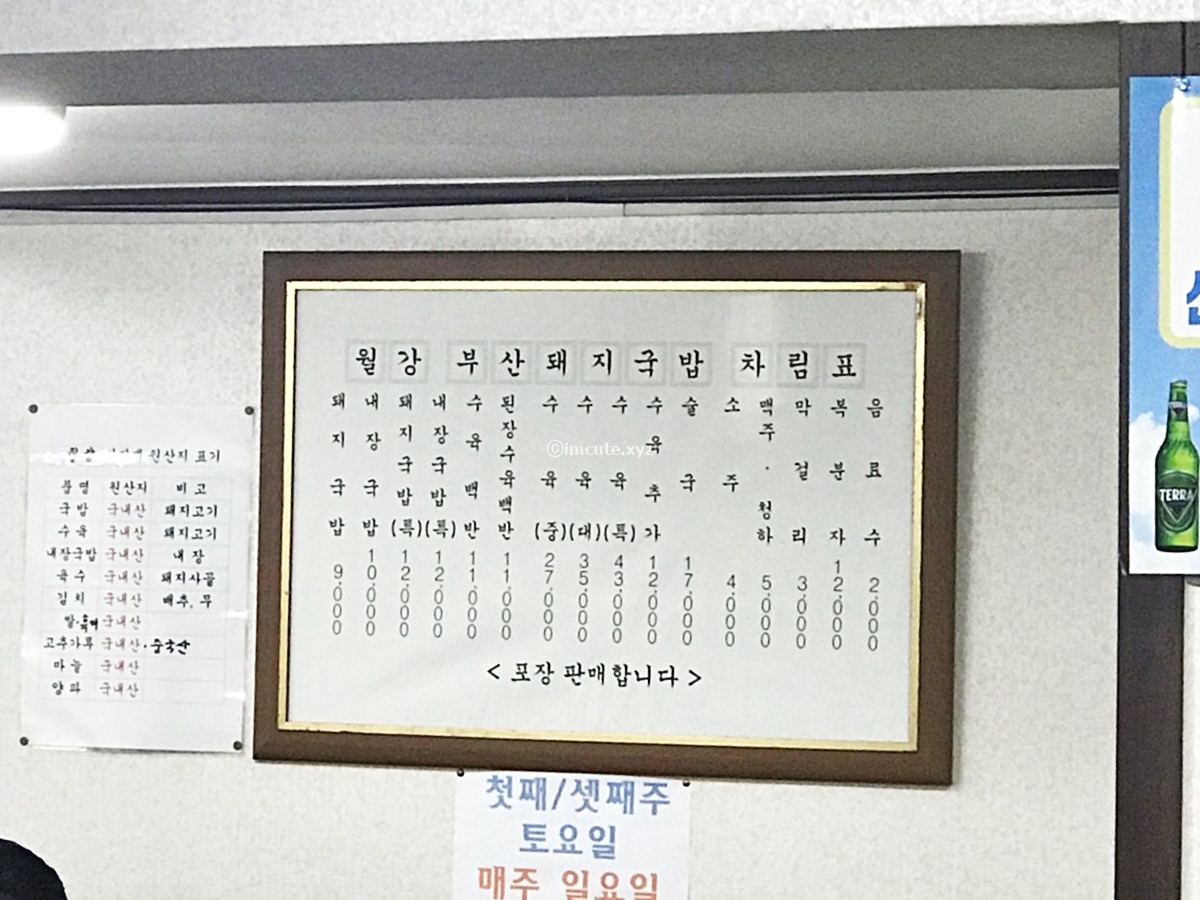 월강은 일단 포장 판매가 되는 집입니다. 그리고 돼지국밥은 9000원의 가격을 자랑하고 있었고요 내장국밥은 만원이었습니다.