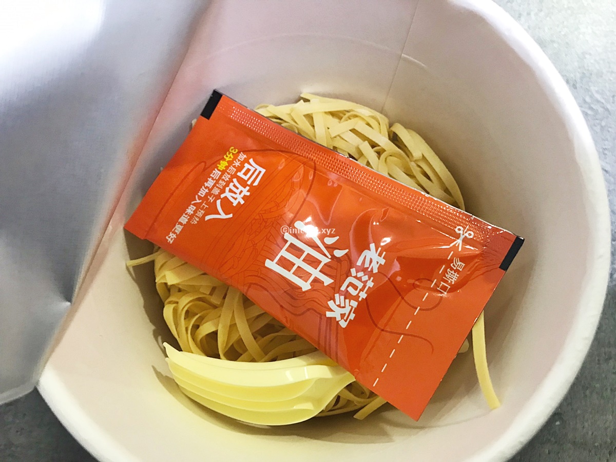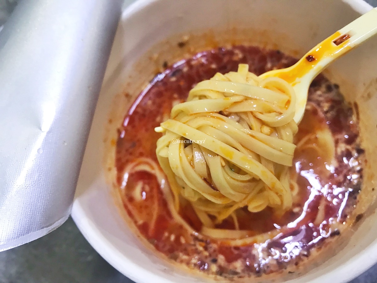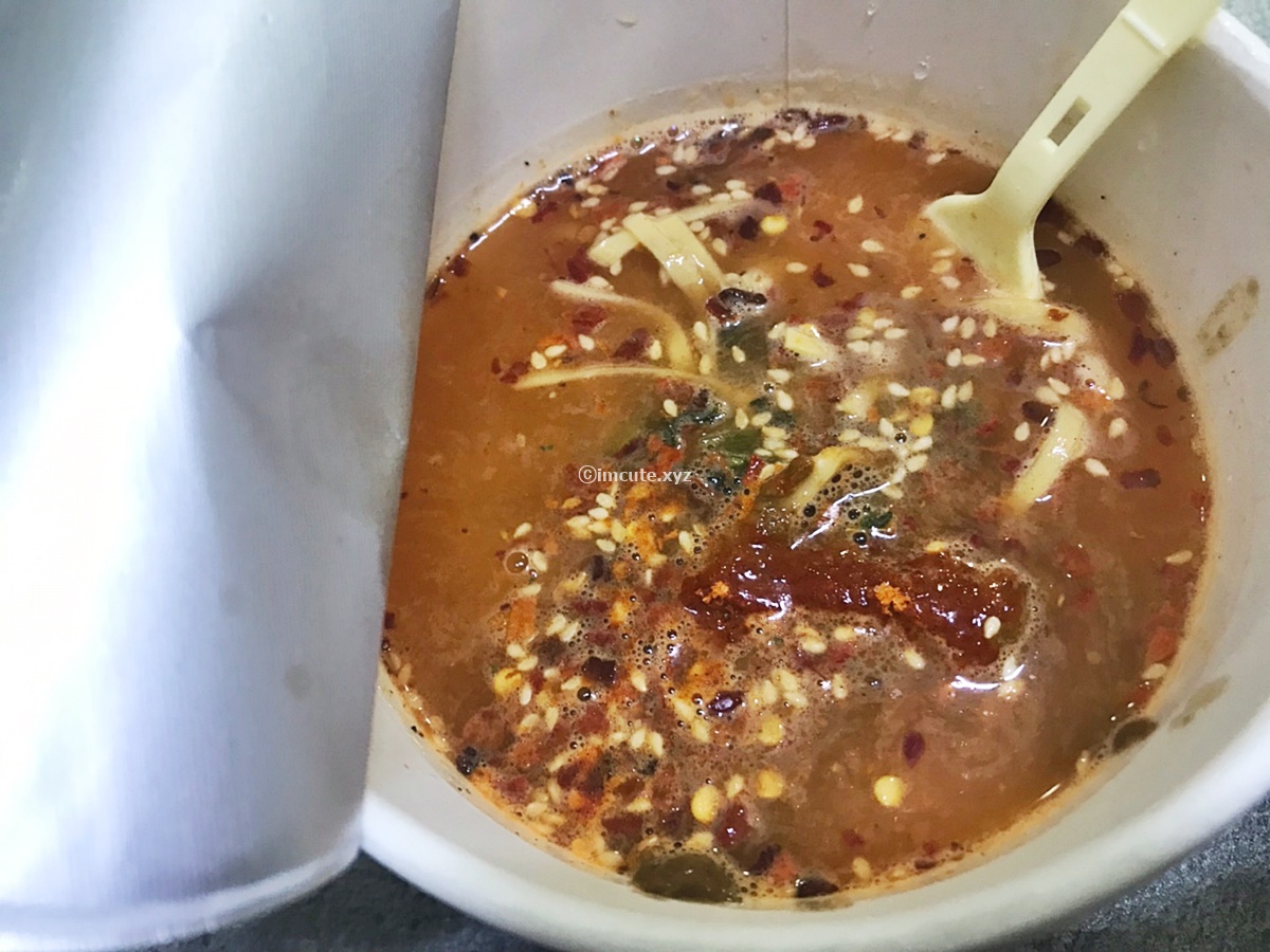 그리고 이렇게. 쉐킷 쉐킷! 벌써부터 좋은 향이 공기를 타고 내 코까지 전해져 옵니다. 포크가 들어있어서 먹기 편한 것도 본 사천식 탄탄면의 장점이었어요. 중국 컵라면은 한국이랑 다르게 가루보다는 이렇게 찐득한 액체 형태로 출시가 되나요? 아무튼 우리나라에선 주로 고급 시리즈에서나 이렇게 짜서 먹는 소스를 보니, 너무나 신기했어요.