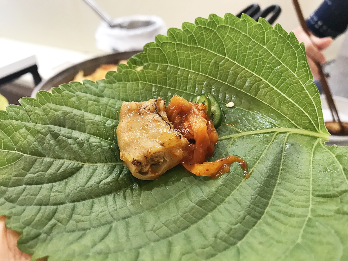 쌈도 싸 먹어봅니다, 이곳만의 별미인데요! 곱창이랑 딸려나온 양파절임을 얹어 먹으니 이맛이 기가 막혔어요. 따로 쌈장을 얹어 먹는 것도 아닌데 간이 잘 맞아서 신기했어요. 저는 깻잎의 이 향도 너무 좋더라고요~