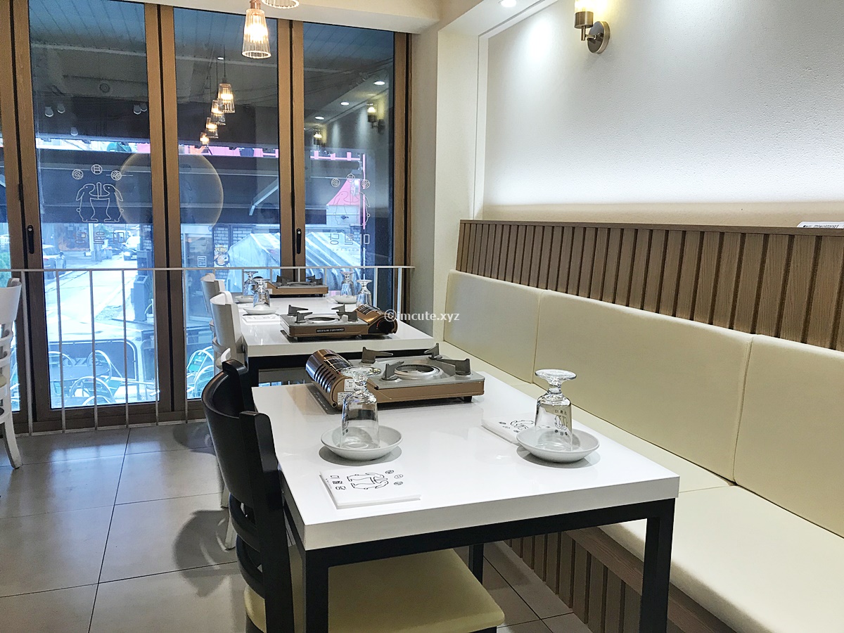 바깥에서 보니 통유리가 멋스러웠고, 내부의 식탁은 넘나 깔끔했습니다. 흰색과 목재 인테리어의 조화가 넘 이뻤어요.