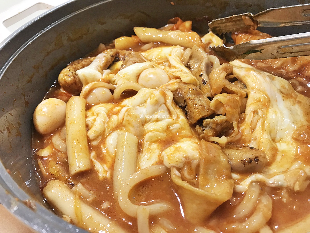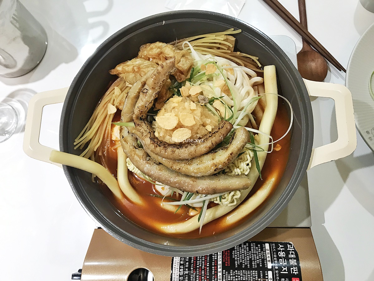 부글부글 익혀주면 이것이 바로 곱창떡볶이 완성! 리필바에서 오뎅이랑 양배추 등은 더 가져와서 익혀주었어요.