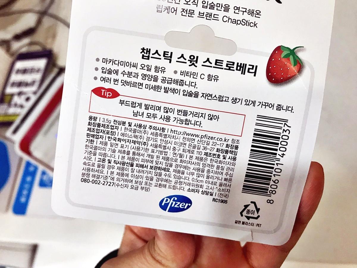 챕스틱 스윗 스트로베리가 정식명칭인거 같고요, 한국화이지제약 이 화장품책임판매업자라고 되어있는 립밤이라고 하네요. 화장품제조업자는 한국콜마 주식회사랍니다.
