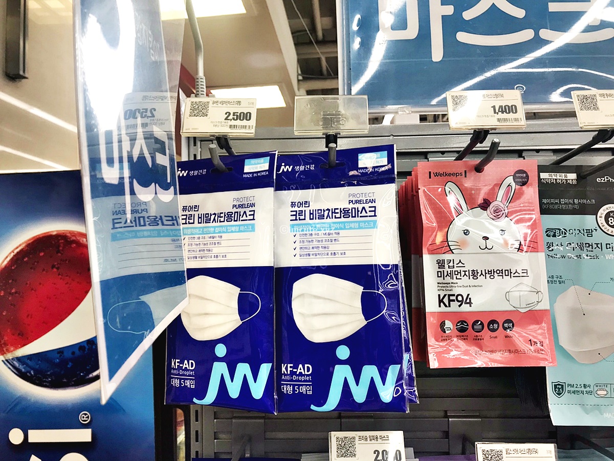 마스크코너는 계산대 바로 앞에 있었는데요 지점마다 다를수 있음에 주의해주세요. jw생활건강의 퓨어린 크린 비말차단용 마스크는 KF-AD 대형 5매입이었고 가격이 2500원이었네요. 웰킵스 미세먼지황사방역마스크는 KF94제품으로 1400원이었습니다. 990원짜리 황사 미세먼지 마스크 이지덤제품이 있었어요.