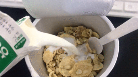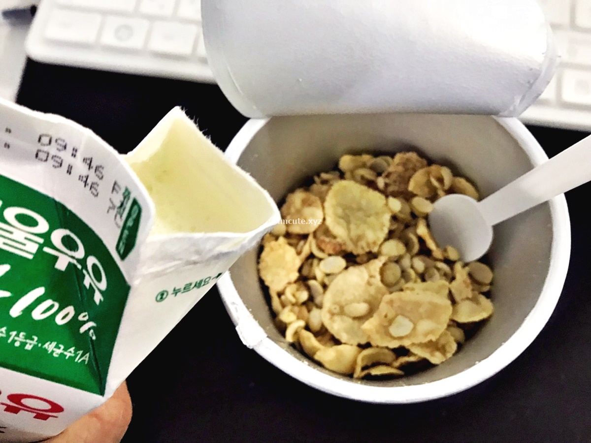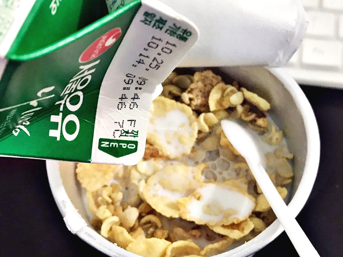 흰우유의 미학을 낭낭하게 느끼고 조금 불려줍니다. 전 살짝 불어있는 콘 프레이크가 그렇게 좋더라고요.