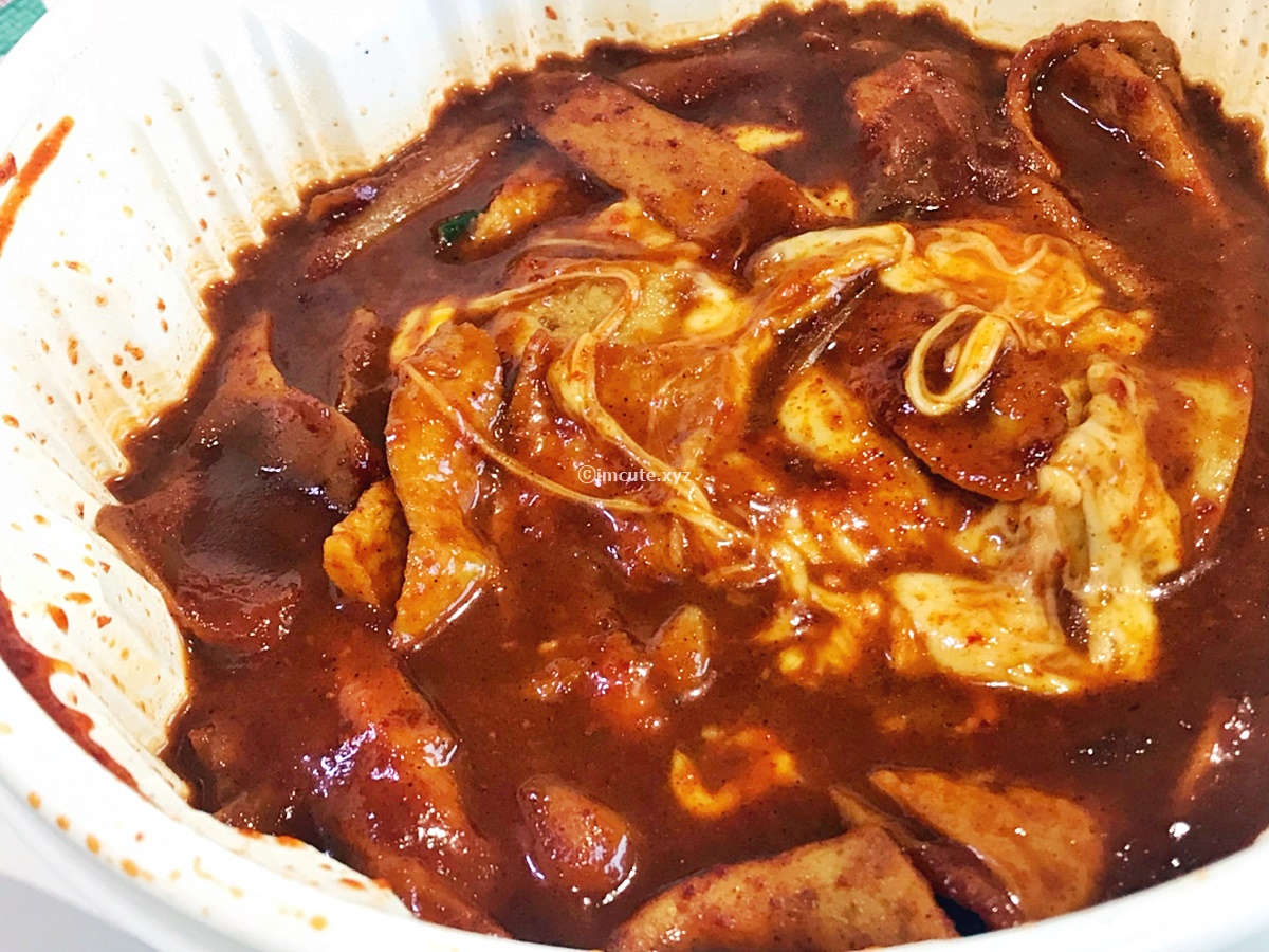 위에 치즈도 많이 들어있습니다. 엽떡이랑은 조금 달리 좀더 텁텁하고 고춧가루가 많은 으른으른한 맛이면서도, 기본 소스 베이스가 단맛도 강하더라고요. 이 국물엔 필수적으로 라면사리가 들어가면 좋을거 같습니다.