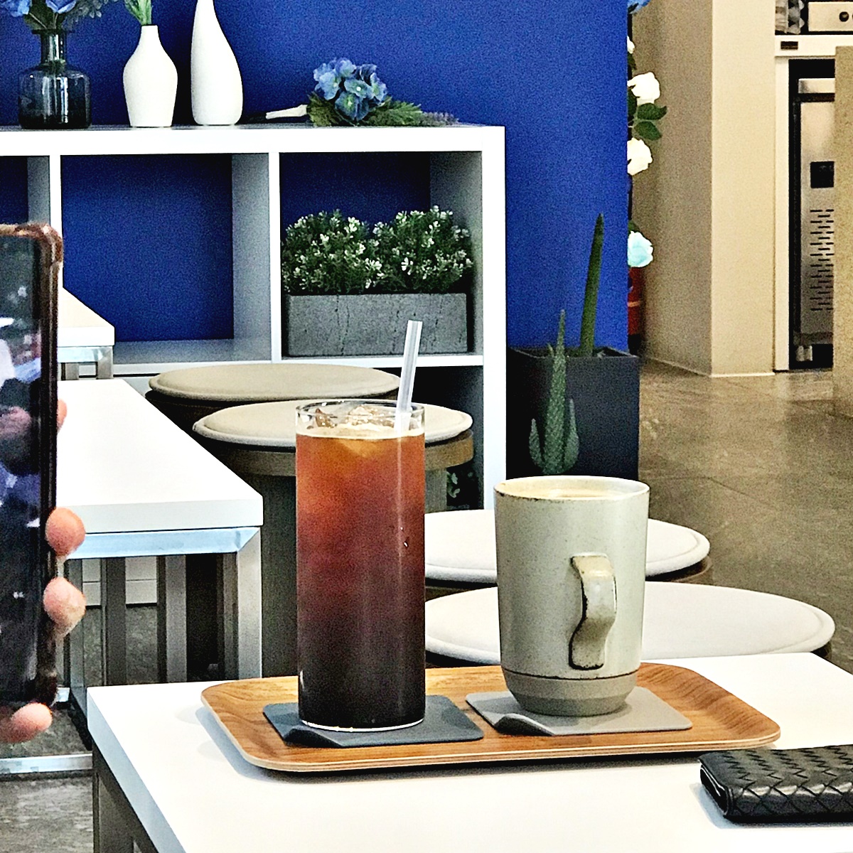 내부는 푸른색 조화로운 인테리어였습니다. 화이트&블루 인테리어는 깔끔하게 매치할 수 있는 컬러인데요 블루 컬러가 정말 쨍해서, 바닷속에 들어온듯한 느낌이 들더라고요. 제가 인어공주가 된 느낌이 들었다랄까요! 구석구석 감각적인 장식이라든가, 사진배치, 그리고 귀여운 테이블 등 정말 미니멀함의 정석을 보여주더라고요. 요즘엔 이런 미니멀 라이프스타일이 끌려서 인테리어도 이런식으로 보고있는데 늠나 이뻤어요.