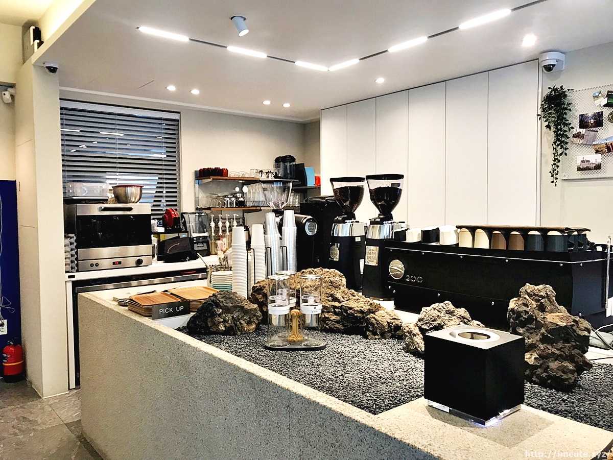 핸드드립 커피를 하는듯한 이곳! 제주 암석 동굴을 옮겨놓은듯한 그런 느낌도 들었는데요 실제 돌이 입구부터 비치되어 있어서 새로운 감각을 뽐내더라고요.