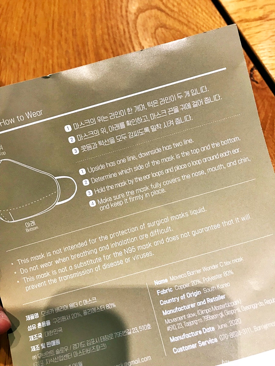 주의사항으로는 착용시 구리마스크인지라 구리 냄새가 살짝 날 수 있다고는 하는데요 그래도 인체에 무해하다고는 하네요. 그리고 세탁할 때는 가급적이면 옷감이 헤질 정도로 힘을 줘서 하기보다는 손빨래나 빨래망에 넣어서 세탁하는게 나을거 같아요.