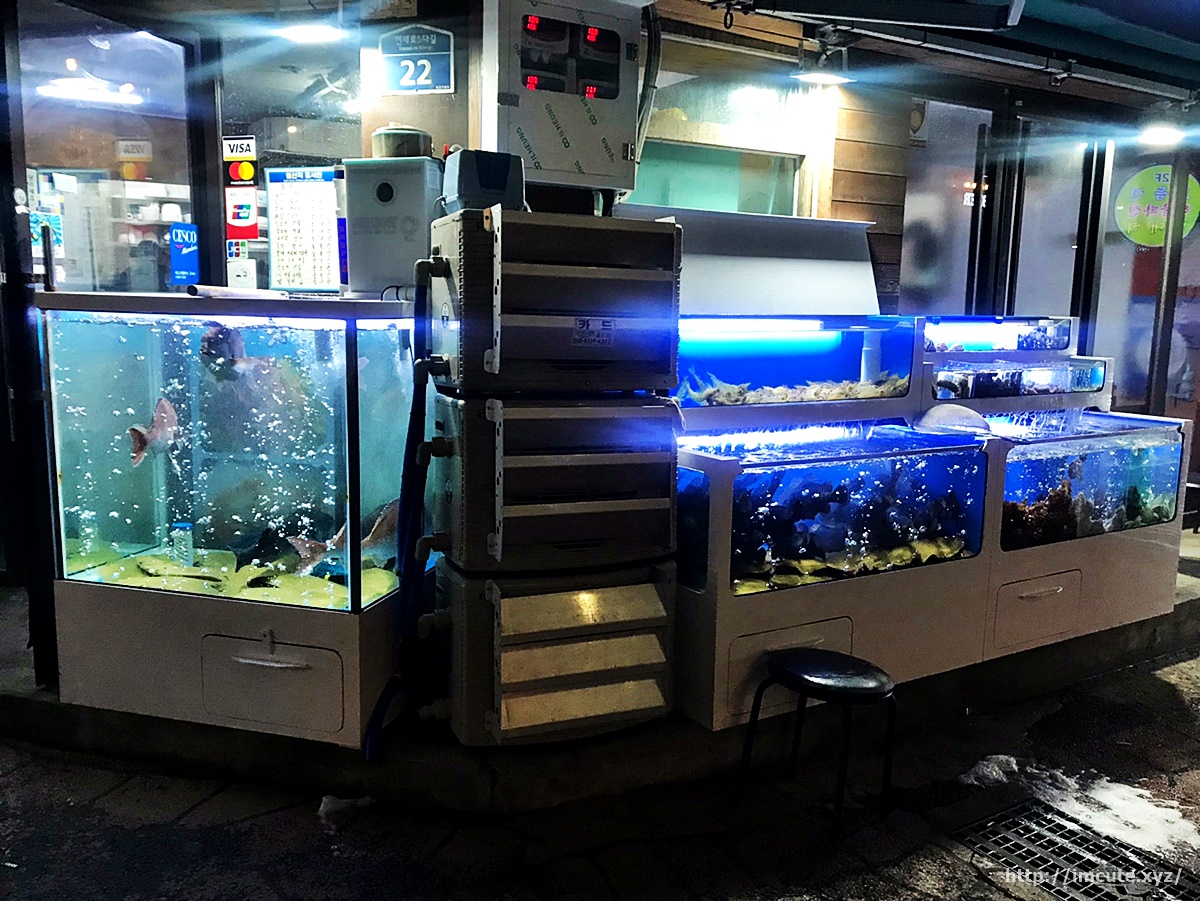 바깥에는 이름을 모를 바다생물..!까지. 아마 광어랑 우럭으로 추정되는데요 바로 활어로 먹어도 너무나도 맛있는 녀석들입니다. 보글보글! 배가 엄청 고팠는데도 이 수족관을 찍은거 보면 저의 먹성. 대다내요