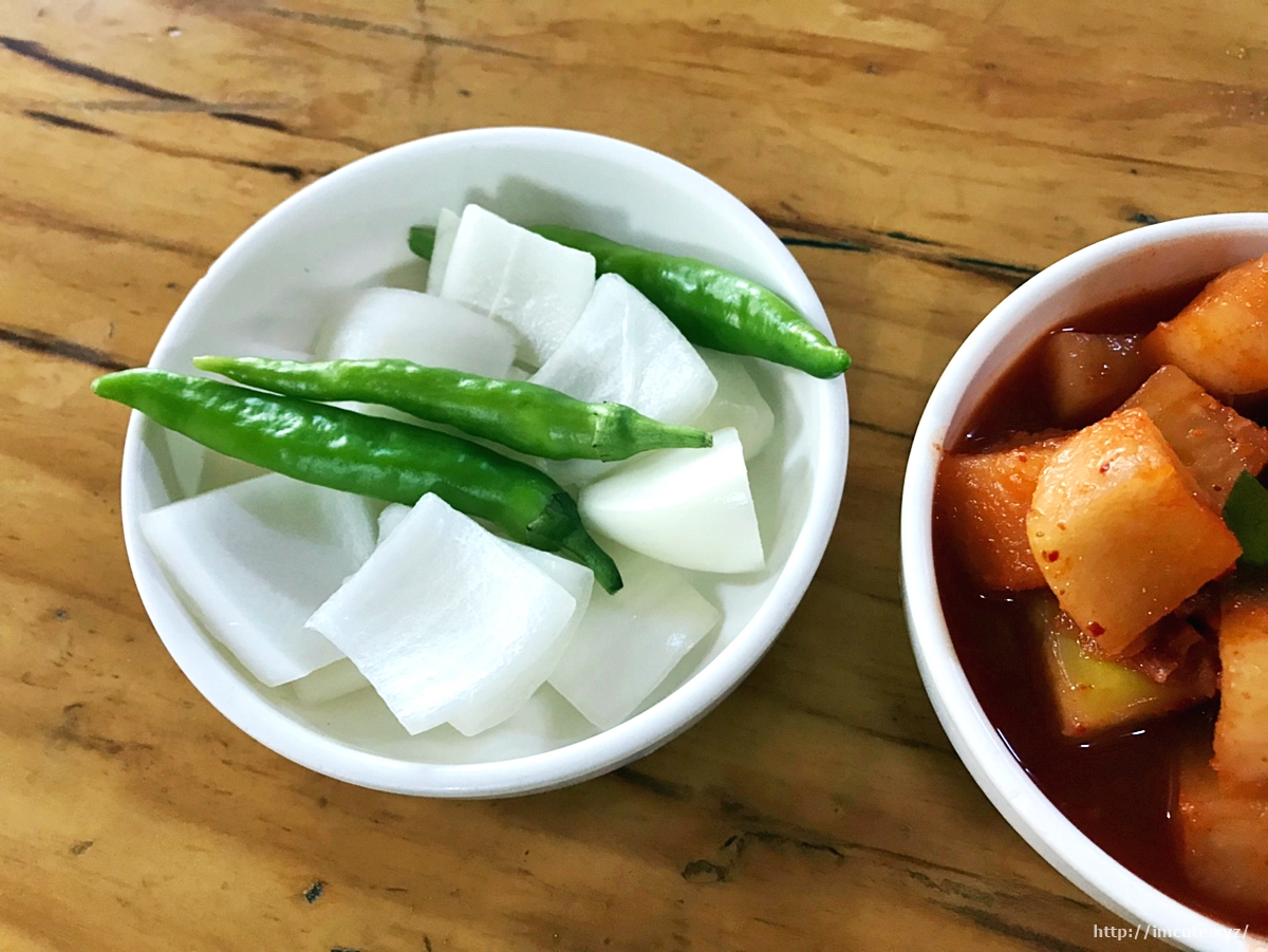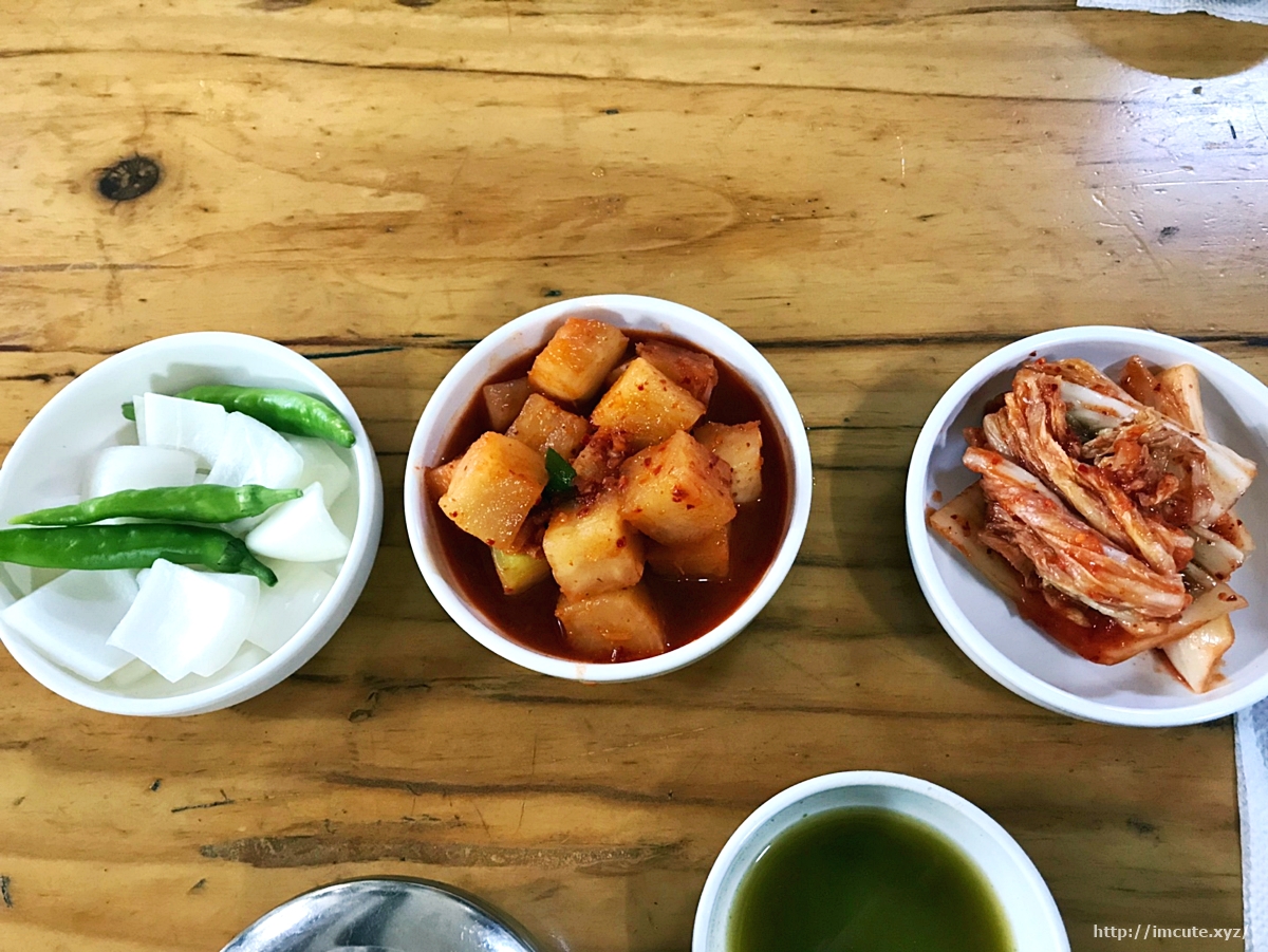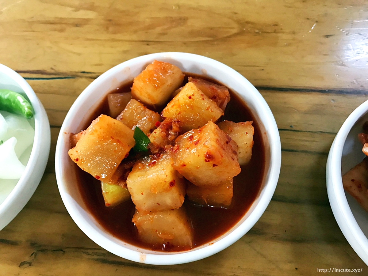 밑반찬 3총사입니다. 돼지국밥이랑만 먹는건줄 알았던 오이&양파도 엿보이고요, 아삭아삭 깍두기에 김치까지!