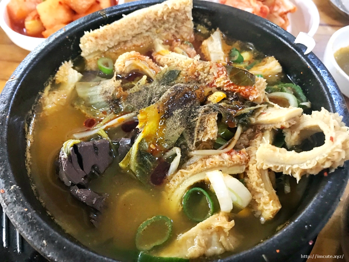 양선지 해장국은 뒤집으면 선지와 건더기가 이렇게 보입니다. 저걸 배추라고 하나요? 시래기라 하나요? 아무튼 재료가 풍성하니 들어있는 데다가 양의 양은 무척이나 많답니다. 이거 다 먹고 소화가 안 되어서 죽을 뻔... 정말 양이 많아요.