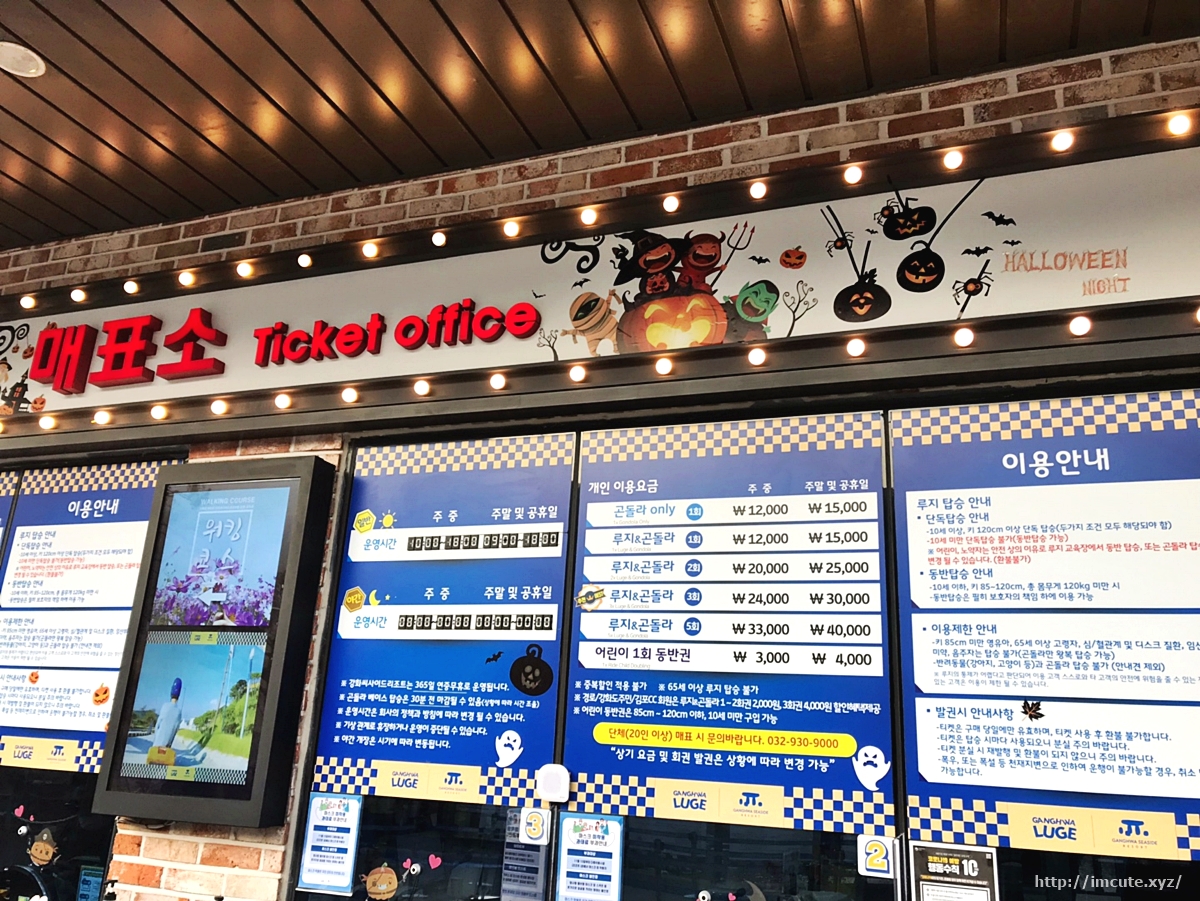 루지 매표소 정보입니다. 곤돌라만 타고 위에 올라가는 가격은 주중12000원, 주말 및 공휴일 15000원입니다. 루지와 곤돌라 1회권은 주중 12000원 주말 15000원입니다. 루지와 곤돌라 2회권은 주중 20000원 주말 및 공휴일 25000원이었습니다. 루지와 곤돌라 3회 주중권은 24000원, 주말 30000원입니다. 루지와 곤돌라 5회 이용권은 주중 33000원, 주말 및 공휴일에는 4만원 이었습니다. 어린이 1회 동반권은 표시한 요금에서 주중경우 3000원을 추가하면 되고 주말은 4000원을 추가하면 되더라고요.!