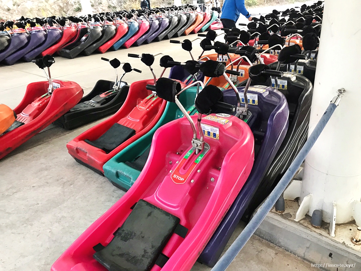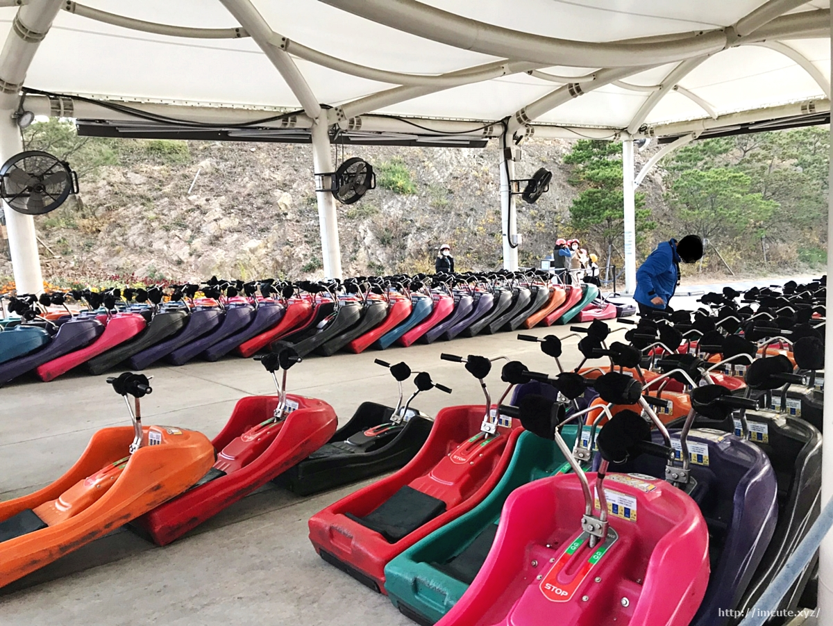 여러가지 차중에 나의 자동차를 골라주고 탑승합니다. 마치 눈썰매장같지 않나요? 저는 검은색도 타고 핑크색도 타고 그랬었어요! 친구랑 같이 출발했지만 엎치락 뒤치락 하면서 경주를 하는데 스트레스가 다 풀리더라고요. 원래 머리가 아팠었는데 높은 고도에서 슝 내려오면서 자유도 만끽했습니다. 근데 운전면허 없는 사람은 좀 어려울거 같던데 벽에 부딪힐 뻔한 적이 좀 있었는데 말이죠. 어린친구들도 하는거라서 얕보았는데 힘은 어느정도 필요하더라고요~ 전복되지 않게 주의사항을 잘 지키시고, 주머니에서 소지품이 안 떨어지게 하시면 될것 같아요!