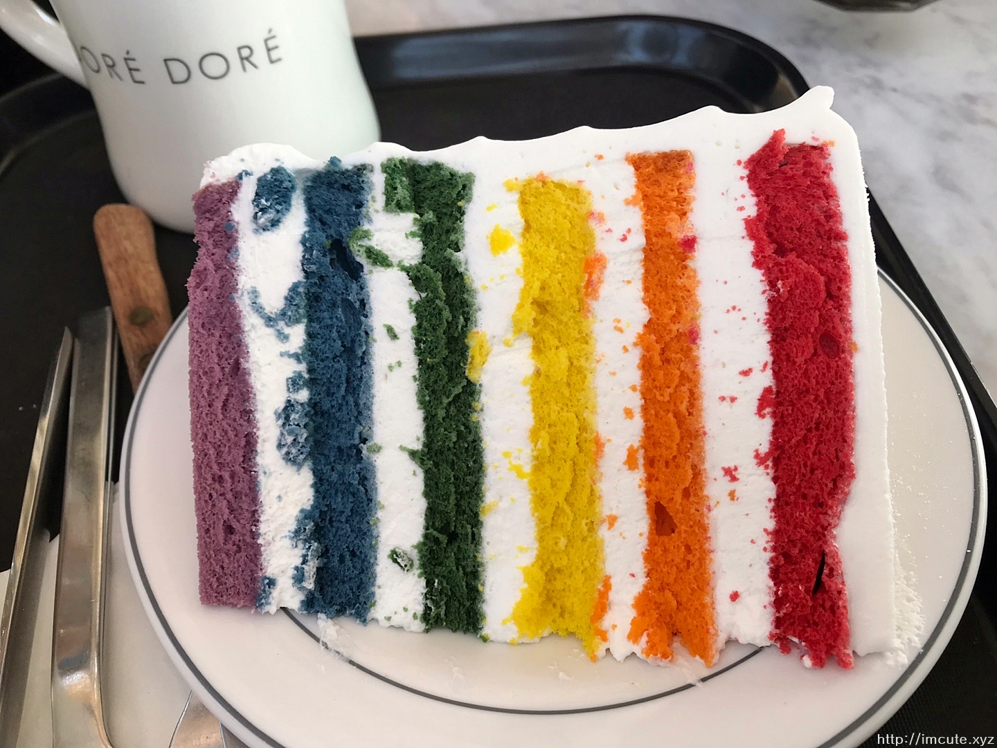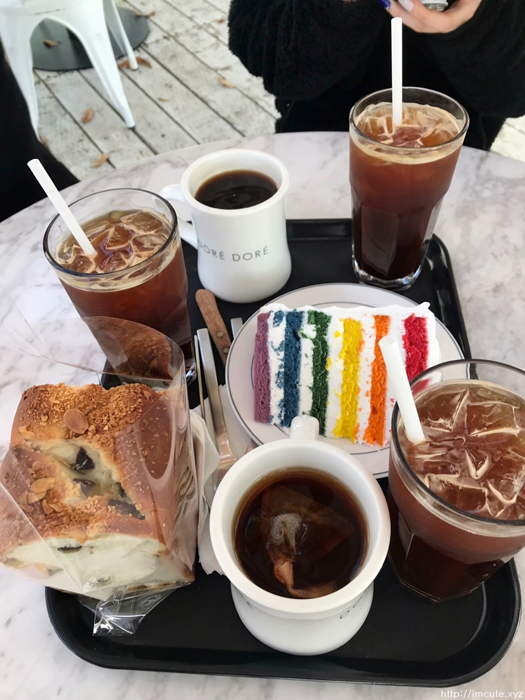 무지개케이크입니다. 시그니처 메뉴라서 시켜본건데요 강화도 카페 탐방까지 와서 이 유명한 거를 안 먹어볼수가 없었어요. 색깔별로 떼어먹었는데 맛이 색색깔 별로 다르진 않았던거 같아요. 대체 이렇게 무지개색을 어떻게 낼 수가 있는것인지 비법이 궁금해졌어요. 크림은 굉장히 눅진하고 맛이 좋았는데요 아무래도 동물성 크림을 사용한 듯했어요.