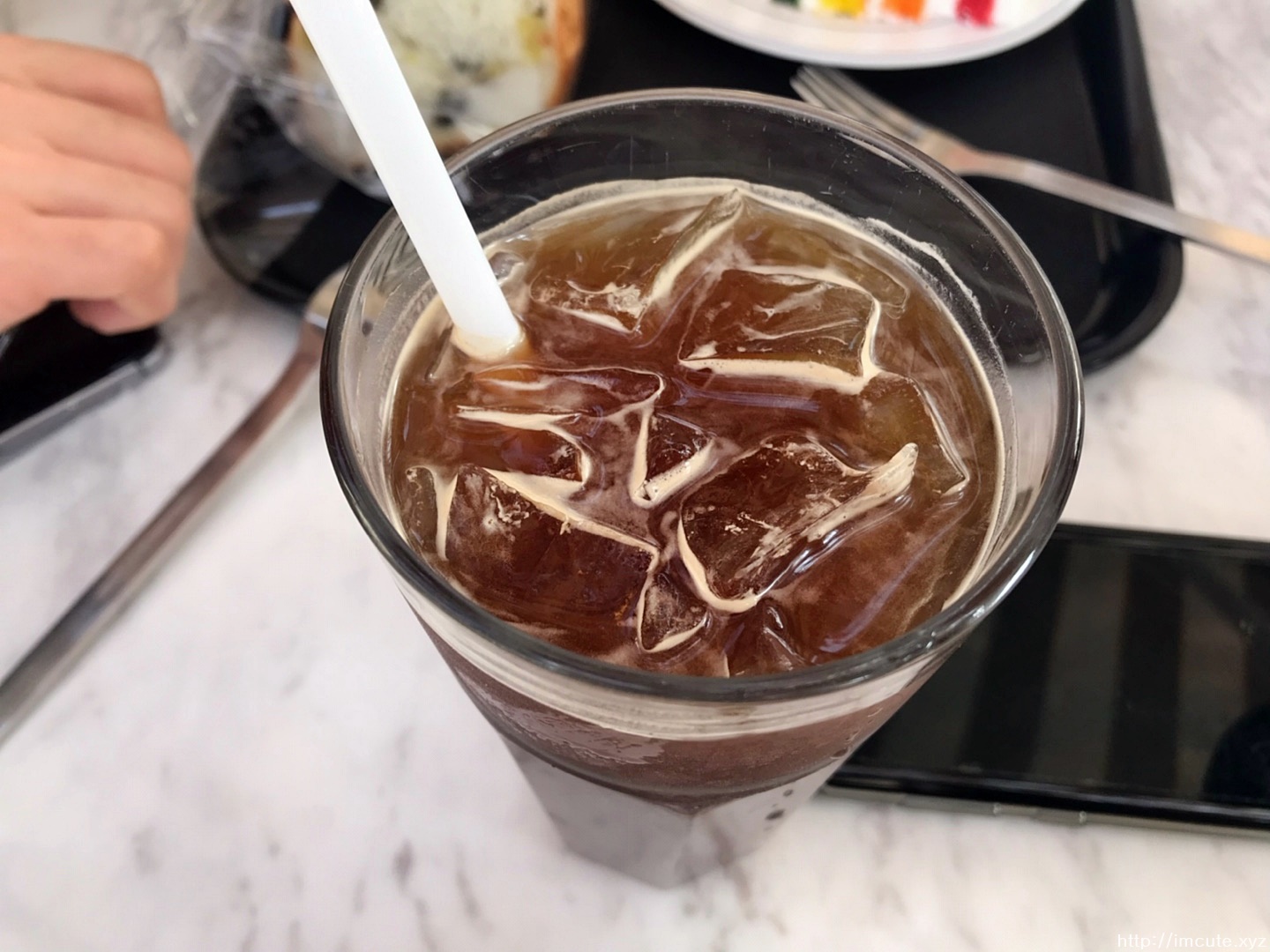 아메리카노는 아이스로 먹었어요. 야외 테라스에서 먹는 거였지만 가을 날씨치고 쌀쌀하지 않아서 아이스로 즐긴거에요. 크레마가 살아있었고 엄청 진하진 않고 보통으로 진한 정도였던 데다가 참 구수했어요.