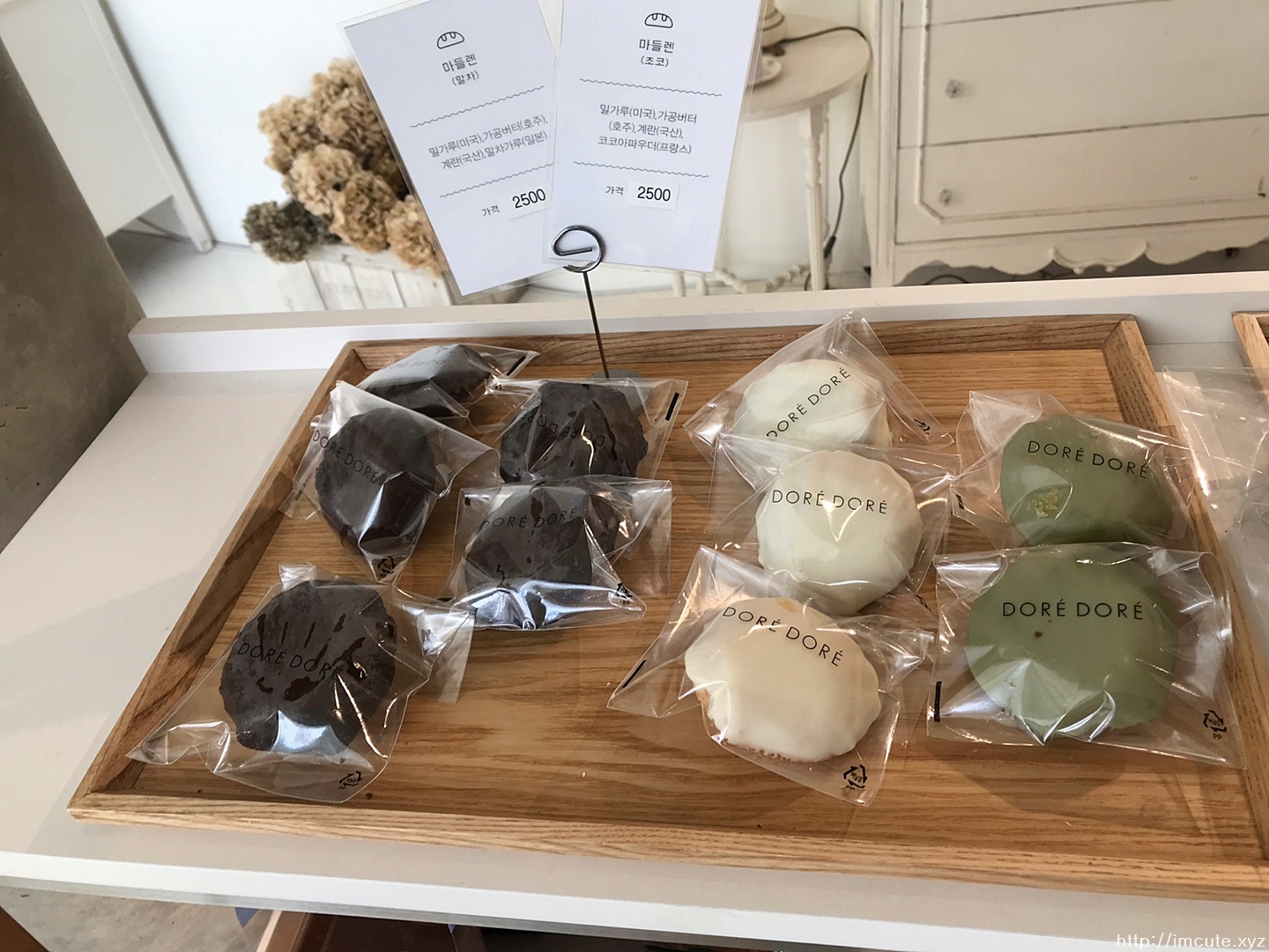마들렌(말차)및 초코마들렌이 보였어요. 여러가지 모양이 다 너무 귀엽고 영어로 DORE DORE라고 써있었어요. 도리도리가 아닙니다.