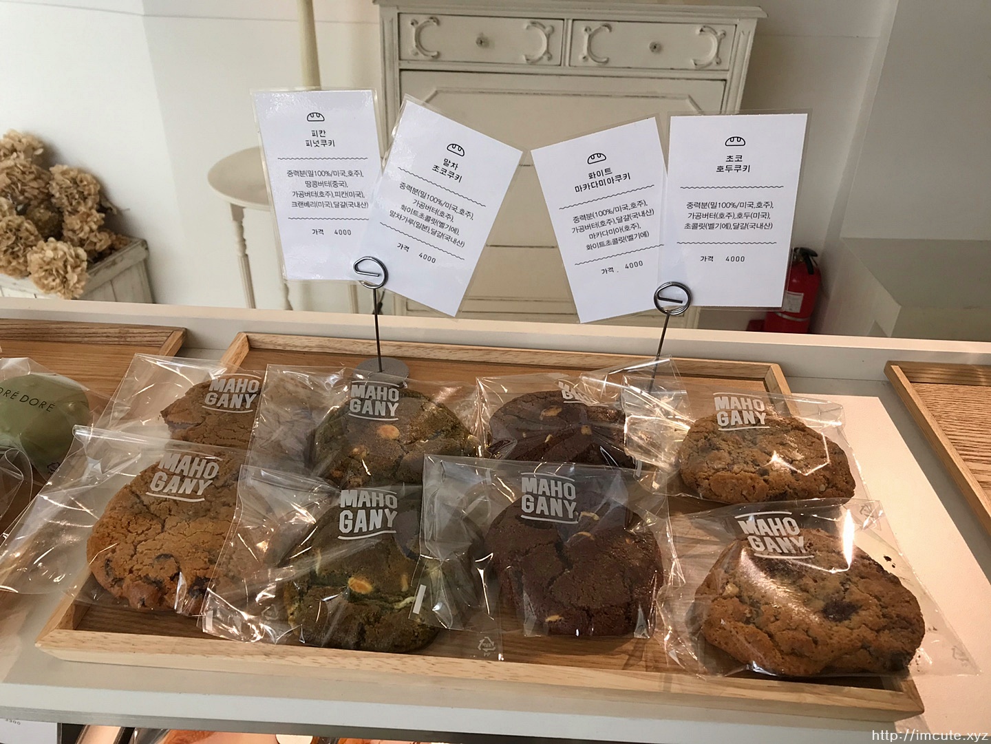 피칸 피넛쿠키, 말차 초코쿠키, 화이트 마카다미아 쿠키, 초코 호두쿠키가 보였어요.
