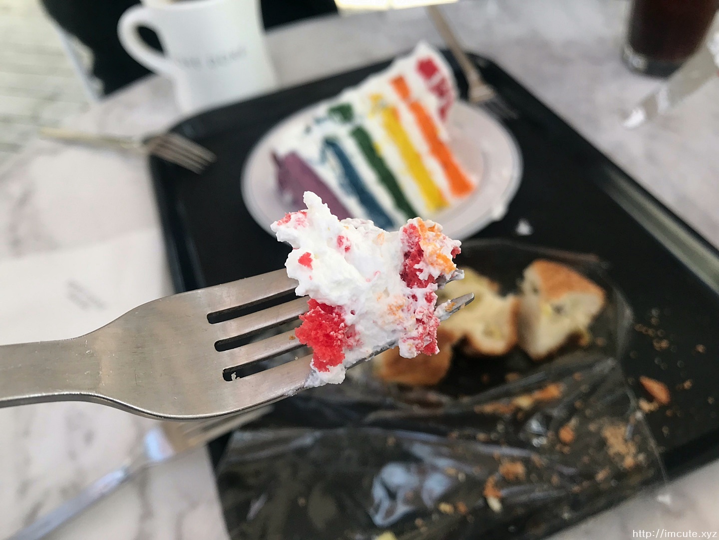 친구들이랑 나눠 먹으니까 정말 좋았고요 포크에 이렇게 들어보니까 굉장히 맛깔날 것 같지요. 확실히 생크림 케이크는 언제 먹어도 사랑인거 같아요. 어릴때 먹던 그 맛 그대로였는데 모양은 무지개 색깔으로 재미났네요.